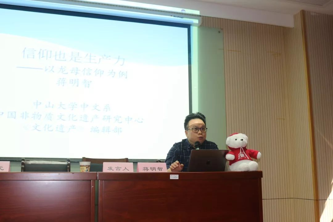 发言结束后蒋明智教授总结认为这是一场别开生面的会议,既是学术研讨又有行业经验学习甚至还可以是招聘会。他提出一方面要把非遗融入到产业里去,非遗的产业前景有无限的可能,希望大家都能投入到非遗的实践里去,另一方面信仰中所蕴含的“重功崇德”思想实际上是当下社会所需求的正能量,希望同学们做有心人,坚定信仰,不忘初心,牢记使命,担当起年轻一代民俗学子的社会责任。
