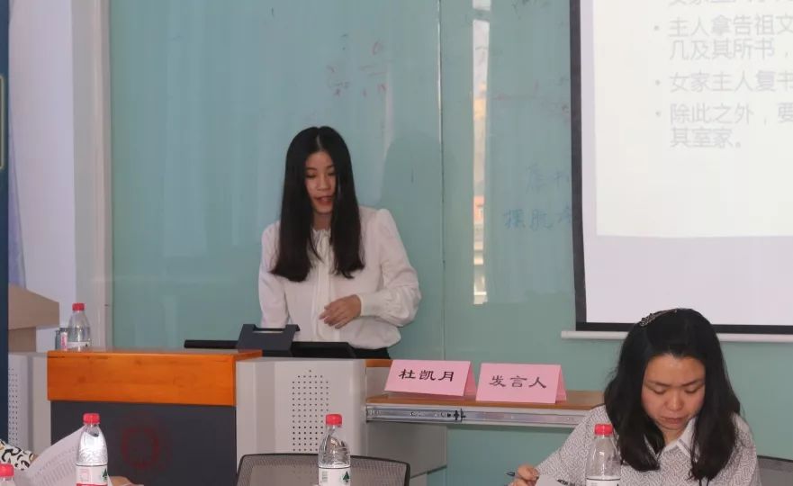 硕士研究生杜凯月以《黔东<纳采告祖文>之告祖婚俗管窥》为题进行发言。告祖婚俗乃源于西周的古老文化,黔东《纳采告祖文》见于清代地方志,具有强烈的地域特色,反映了“改土归流”背景下,少数民族在宗法制度和宗法观念的指导下,告祖行孝,祈求福佑,其婚俗融合中原地区儒家文化,又不失本族特色。由于后世诸籍多语焉不详,因而黔东《纳采告祖文》具有丰富的民俗学、文献学、历史学价值。