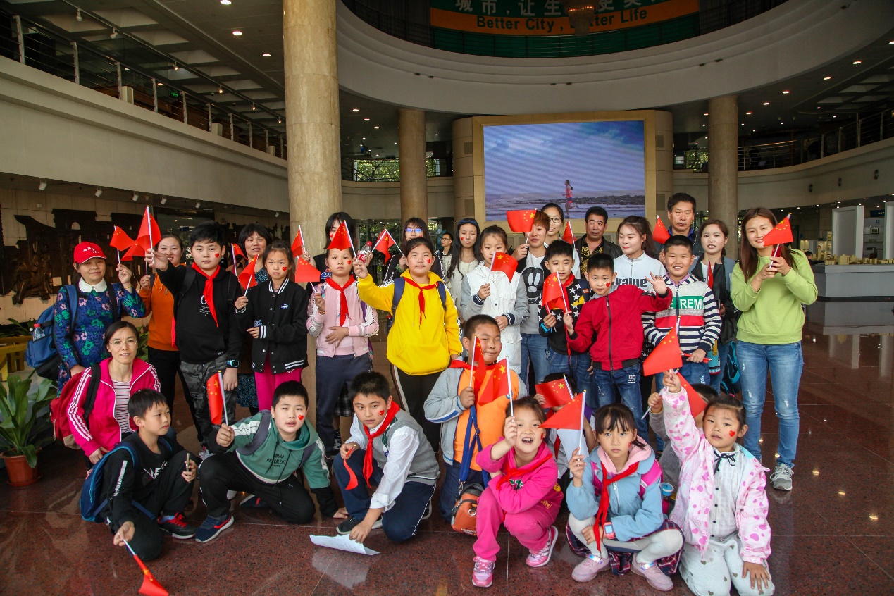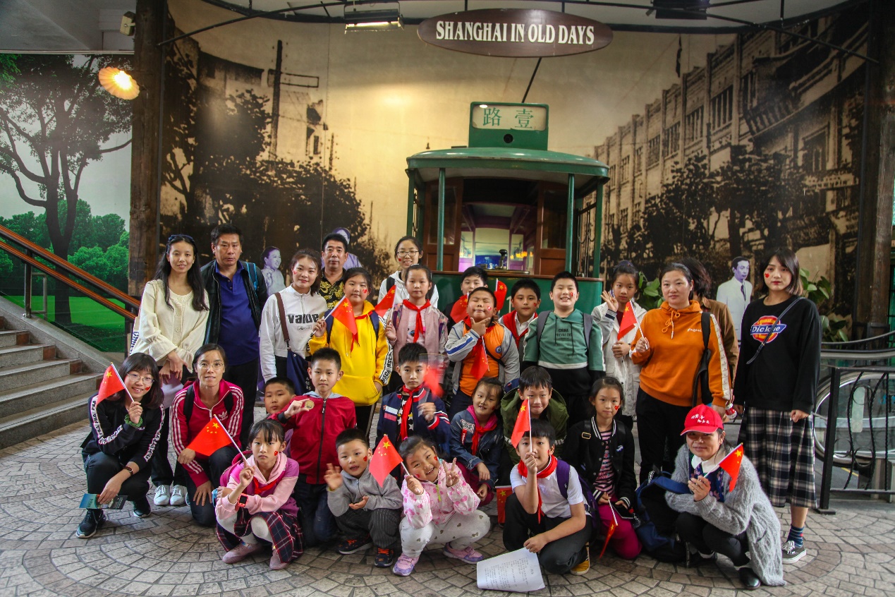 下午4点,参观旅程结束,孩子们在志愿者的带领下有序离开了展览馆,最后所有志愿者,家长和小朋友们在上海1930风情街前合影。
