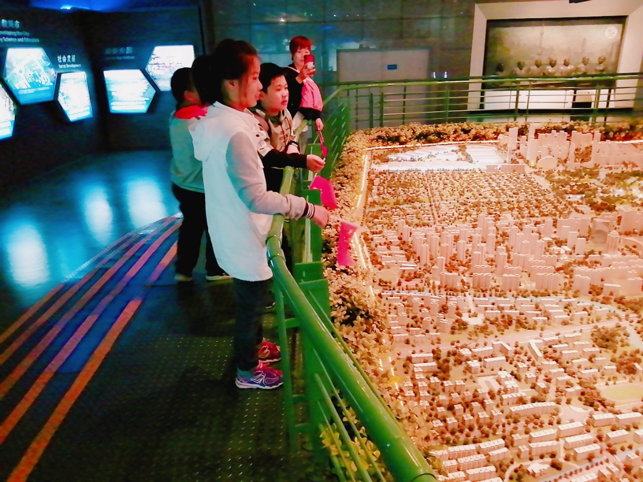 上海城市规划展示馆以“城市、人、环境、发展”的展示主题,通过详尽而权威的资料和信息,运用图片、模型、触摸屏、多媒体演示等多种展示手段,充分展示了上海城市发展的“昨天、今天和明天”,是全面认识上海、深入了解上海的最佳选择。一进门就是上海的各标志建筑组成的塑像,加上旧上海滩的情景壁画,全上海城市地图的地板,开启了上海规划馆一楼大厅的城市序曲。孩子们有秩序地站好了队,志愿者姐姐们给孩子们发了国旗和国旗小贴纸。
