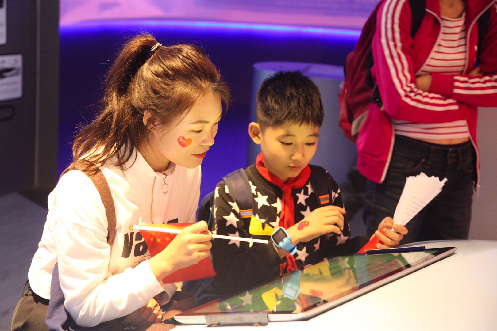 从志愿者手中领取国旗贴纸