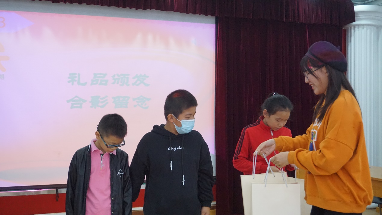 学生会主席叶姝蝶同学为小朋友们分发礼物。看着小朋友们脸上开心的笑容,志愿者们也受到了极大地感染与鼓舞。