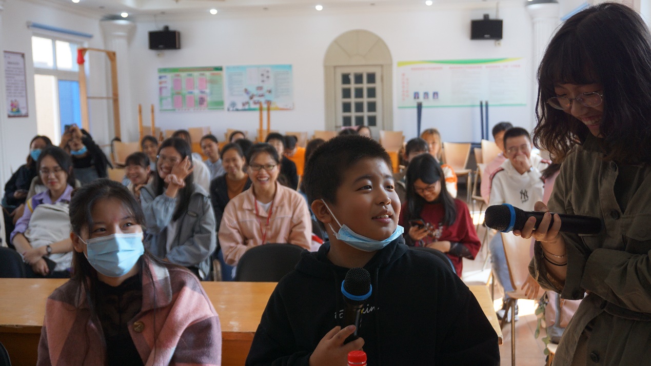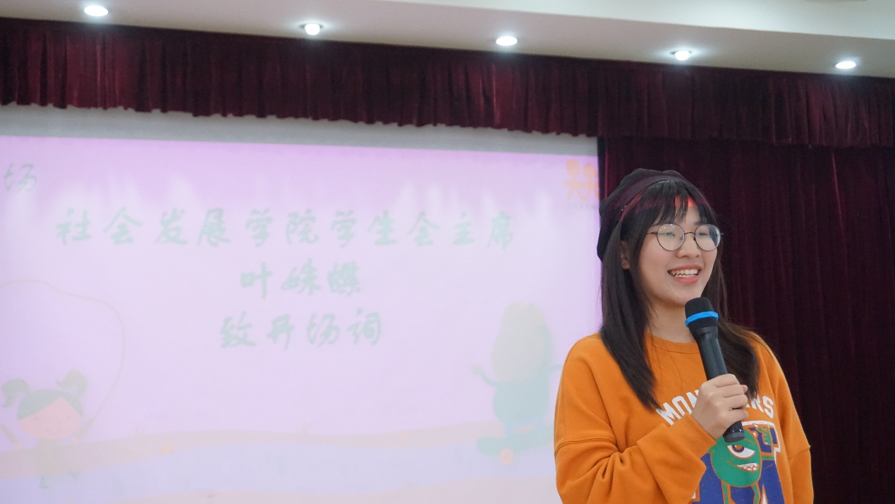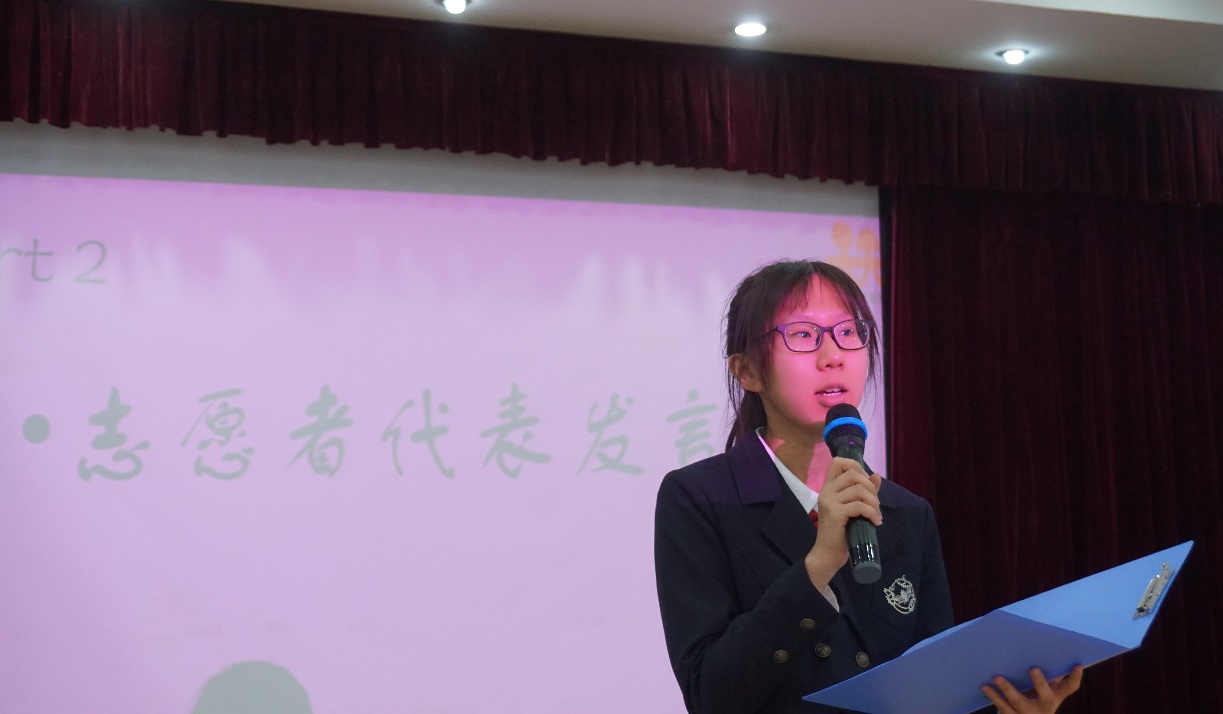 学生会主席叶姝蝶致开幕词。叶姝蝶同学被现场温馨的气氛所感染,抛掉稿子分享了自己做志愿活动的亲身经历与感悟。她提到“虽然我们的能量很小,也许只能教给小朋友们几个单词、几道算术题,但对小朋友们来说,我们的相伴、我们的爱心才是最珍贵的。‘哥姐’计划已经走到了第十二个年头,我们仍然要保持初心,以传递爱与温暖为己任。”