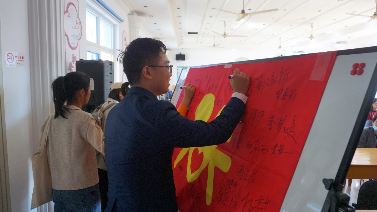 13:00左右,志愿者们从学校乘坐大巴到达活动场地,在小干事的引导下依次在“哥姐”计划的旗帜上签名。在等待正式开始的时间里,主持人邀请了几位志愿者以及到场的小朋友代表进行了自我介绍,现场的气氛很快变得轻松愉快起来。