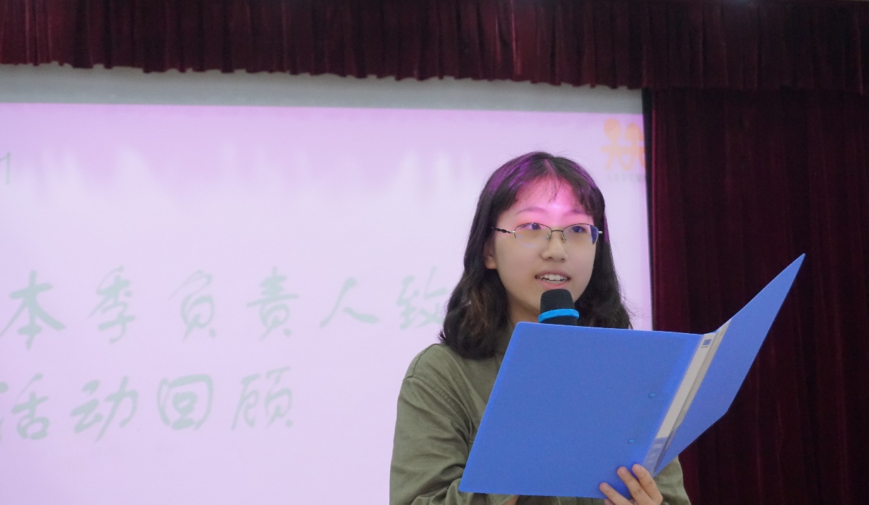 紧接着,本季活动的志愿者代表柴圣坤同学上台发言。她作为上一季“大哥哥大姐姐”计划的参与者之一对新一代的志愿者提出了几点建议:第一,每个人都是拥有无限潜能的个体,我们要看到每个小朋友的特别之处和闪光点;其次,由于时代变迁,距我们小时候教材已经几经变革,志愿者们要充分备课,做好准备;第三,我们要充分利用网络资源,跟进最新的教材。最后,她希望我们都能在活动中获得宝贵的体验。