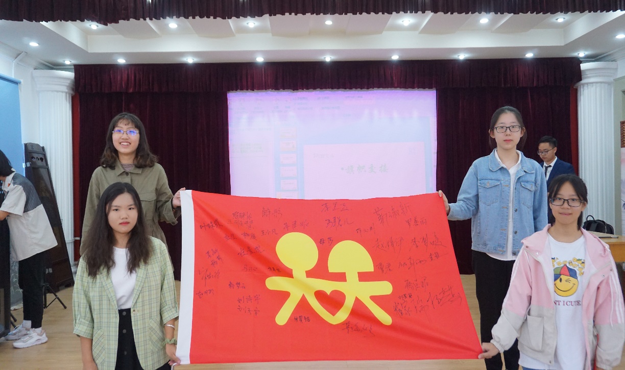 接下来进行的是“大哥哥大姐姐”计划的旗帜交接仪式。第十二季负责人钱璟洁同学和张可歆同学将这面凝聚着爱与希望的交到了本季干事代表苏佳妮同学和熊静怡同学手中。接过这面饱含着欢乐与感动,承载着一代又一代“大哥哥大姐姐”爱心的旗帜,志愿者们感受到了自己肩上的重任。