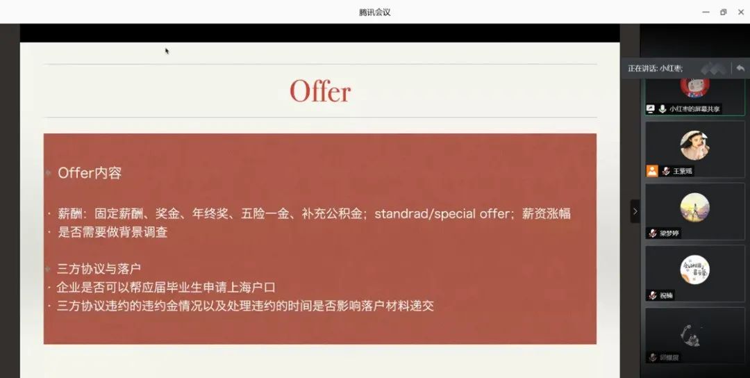 最后,学姐在offer的各个方面做出解释,并在薪酬、三方协议、落户问题和违约处理等方面进行详解。