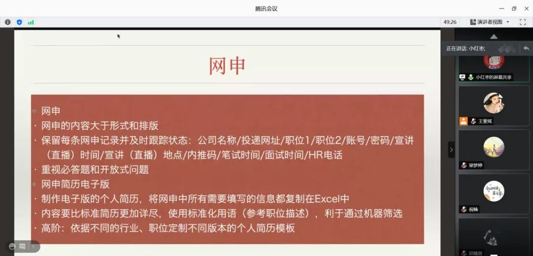 需要提及的是,在分享中的一些注意事项看似简单但却是非常重要的,比如保留网申记录并及时跟踪,以免让自己陷入混乱的状态和情绪里。这些都被吴相仪多次提及,现场的同学们表示受益匪浅。