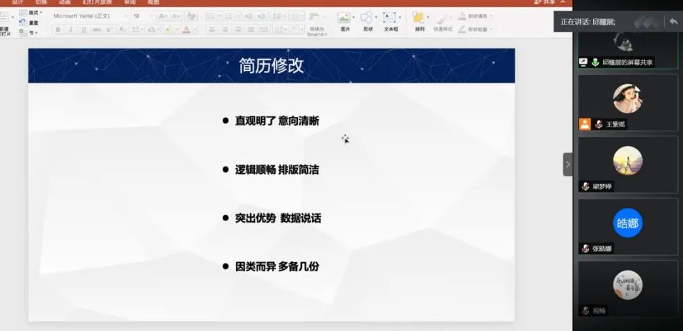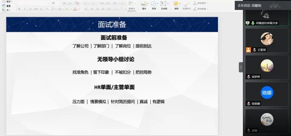 面试部分,邱耀展通过分享自己的实习经历,深入浅出的点明目前实习面试的盲点与注意事项。在细节与具体步骤上,又倾囊相授“无领导小组讨论时可以充当计时员”等面试方法与技巧,最后在时间观念和心理建设表达了自己的一些调节方法,给同学们很大的启发与鼓舞。