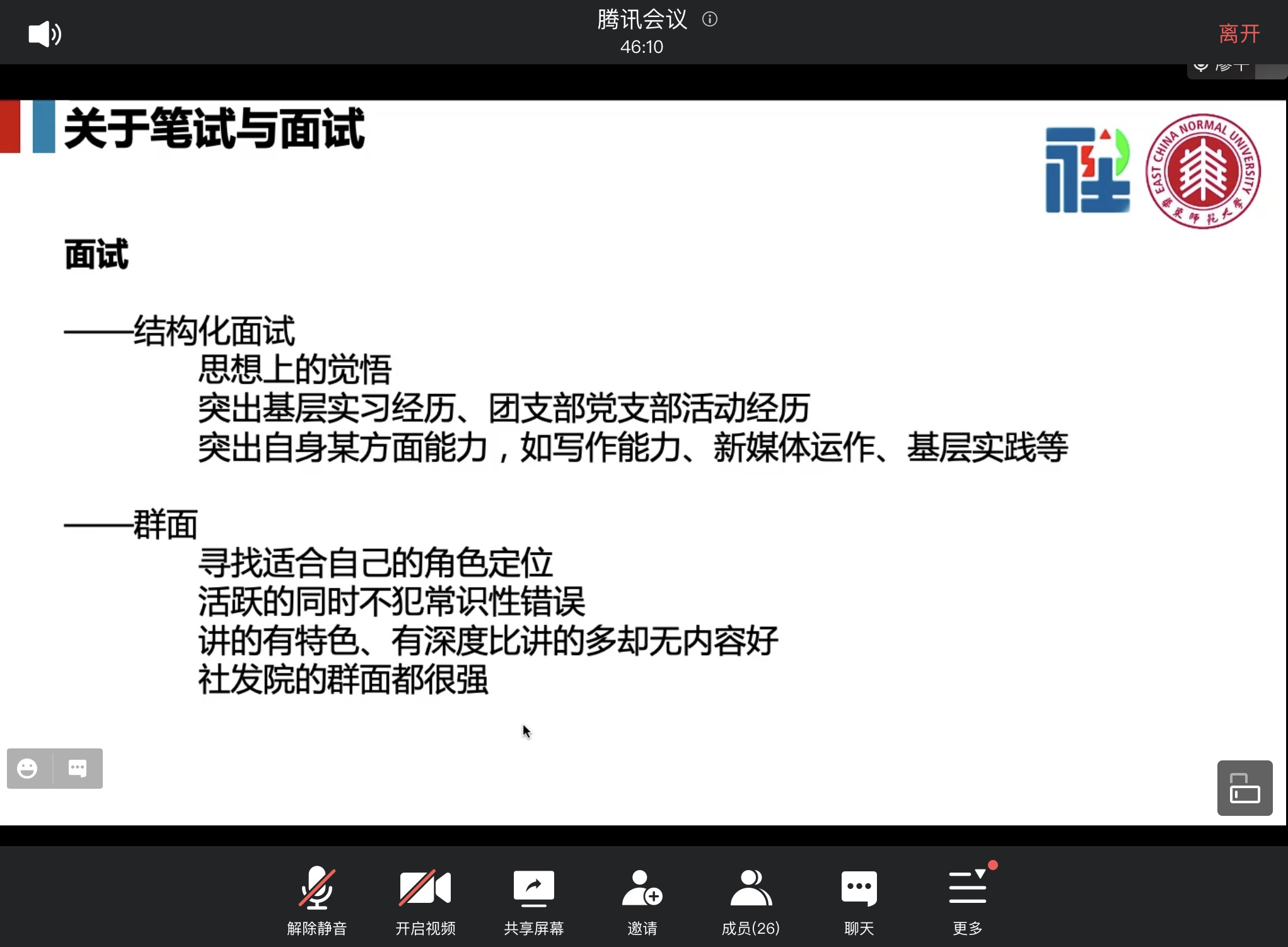 10月24日晚7点,立足当下,“职”面未来——求职系列活动第三场体制内就业分享会——公务员与选调生专场,在腾讯会议顺利举行。