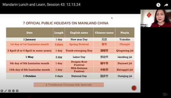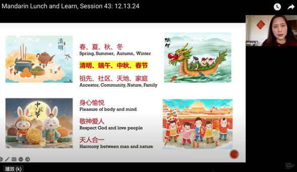 民俗学研究所李明洁教授,应纽约华美协进社的邀请,主讲中国传统节日的系列英文讲座。华美协进社1926年由胡适、郭秉文、杜威和孟禄等中美教育家创办,是美国历史最悠久的专注于中国文化的非盈利机构。该讲座从2024年9月到2024年12月,每月一次,是该社2024年秋季的“午间中文”线上教育活动,很受北美和其他英文地区民众的欢迎。