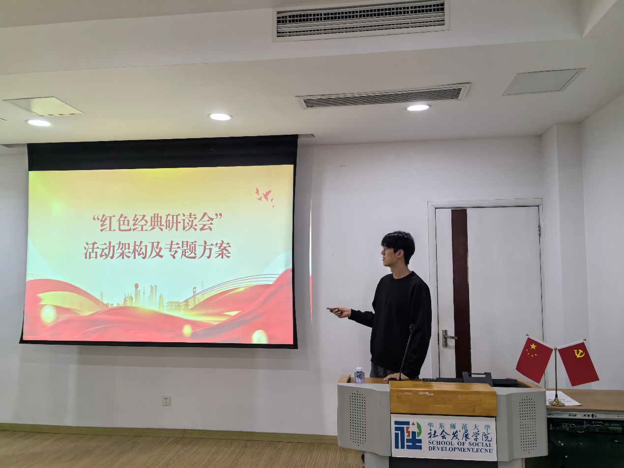最后,支部宣传委员赵子丞从“红色经典研读会”活动背景、形式设计与内容编排等方面详细介绍了活动架构。与会党员和入党积极分子就“红色经典研读会”的体系框架进行讨论,围绕研读会分享形式、主题选择等提出了诸多宝贵建议。活动将采取“双线结构”,即“党史经典”与“同阶段社会学视角下的红色经典”并行推进。每期围绕三本相关著作展开,内容上将按照历史脉络系统展开,并逐步过渡至专题研讨模式。在组织方式上,活动实行轮流主持制,每期由三位同学担任导读人,负责领读经典并引导现场交流。