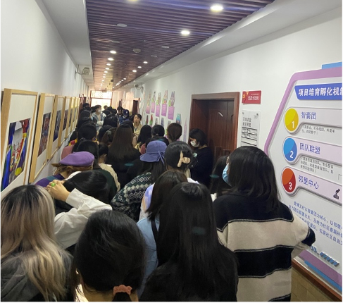 活动伊始,新虹街道街道爱博五村党支部书记陈蓓苾表达了对吴老师、何老师以及同学们的热烈欢迎。陈书记介绍了过去十年来爱博五村的社区变化,以及社区工作者的日益年轻化。新时代社区治理的难点对社区工作者的能力也提出了更高的要求,希望社会工作专业的同学未来到社区服务,用专业的知识和方法推动社区的发展。在现场陈书记以宣传安装反诈APP为例,向同学们介绍了居委会展开社区工作时常用的技巧。随后,陈书记带领同学们参观社区转型的展板、红色物业长廊、记忆角和邻里中心,并详细讲解了爱博五村的历史发展历程和社区的特色板块,在参观过程中陈书记还与同学们进行了友好互动。