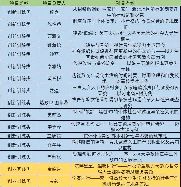 金皓月同学的“‘陪伴星星,温暖同行’——高校学生助力大龄心智障碍人士照料者喘息服务实践”项目发现了目前社会对大龄心智障碍人士照料者这一群体关怀的缺位,带领大家构建了相关服务的基本雏形,充分体现了人文关怀;黄兰棋同学的“透视熬夜:现代生活的时间制度、时间伦理和自我技术——以高校学生为例”,深度剖析了熬夜现象,透过其表象领会到时间制度、时间伦理及自我技术三方的关系,从社会学视角出发的对熬夜行为了一次全新探索;