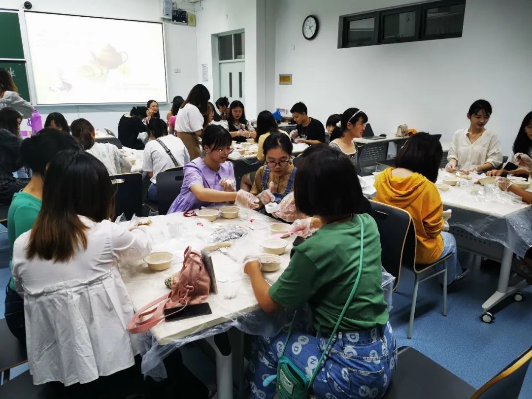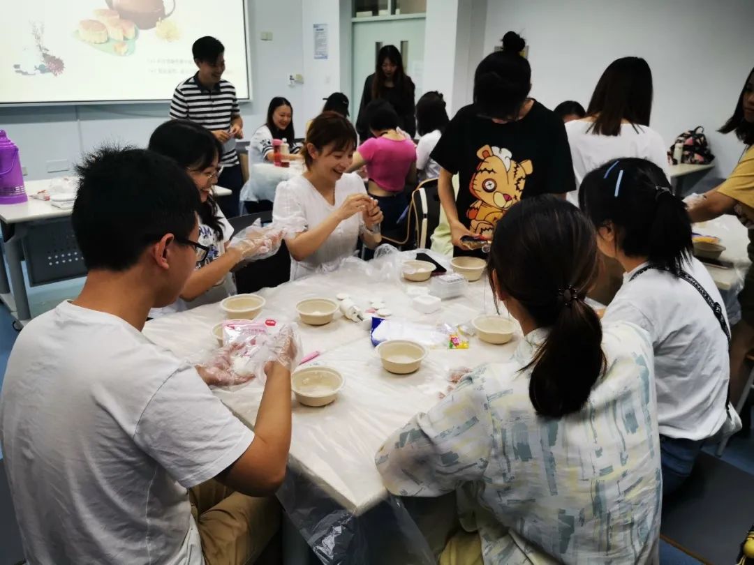 做月饼无疑是到场同学们最期待的环节,在主持人的要求下,同学们根据喜欢的月饼馅料自行分组,组成了5个队伍,按照大屏幕上的制作方法,共同制作精美的冰皮月饼。月饼模具的花色多种多样,最受欢迎的是小兔子模具,最受欢迎的馅料是豆沙和莲蓉,经过半个多小时热火朝天的制作之后,同学们相互分享自己的作品,品尝各自的“手艺”,各个队伍也纷纷展示出自己的代表作品,一比高下。