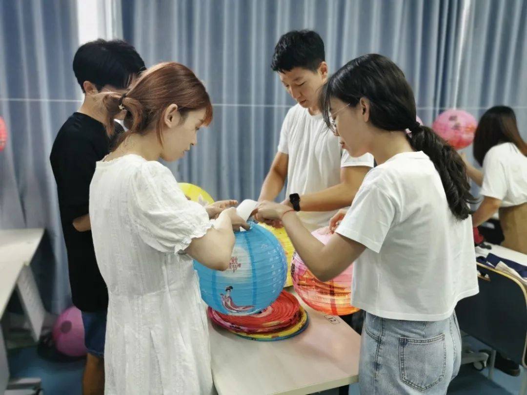中午时分,工作人员早早来到活动场地,有条不紊地开始布置教室,合并桌椅,悬挂中秋灯笼,整理月饼纸盒。随着活动开场时间的临近,同学们陆陆续续进场,相互聊天交谈,一派热闹的节日景象。