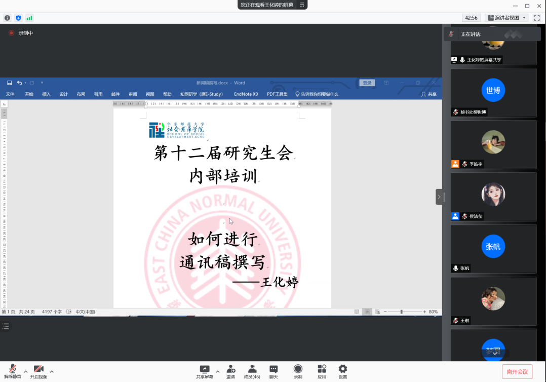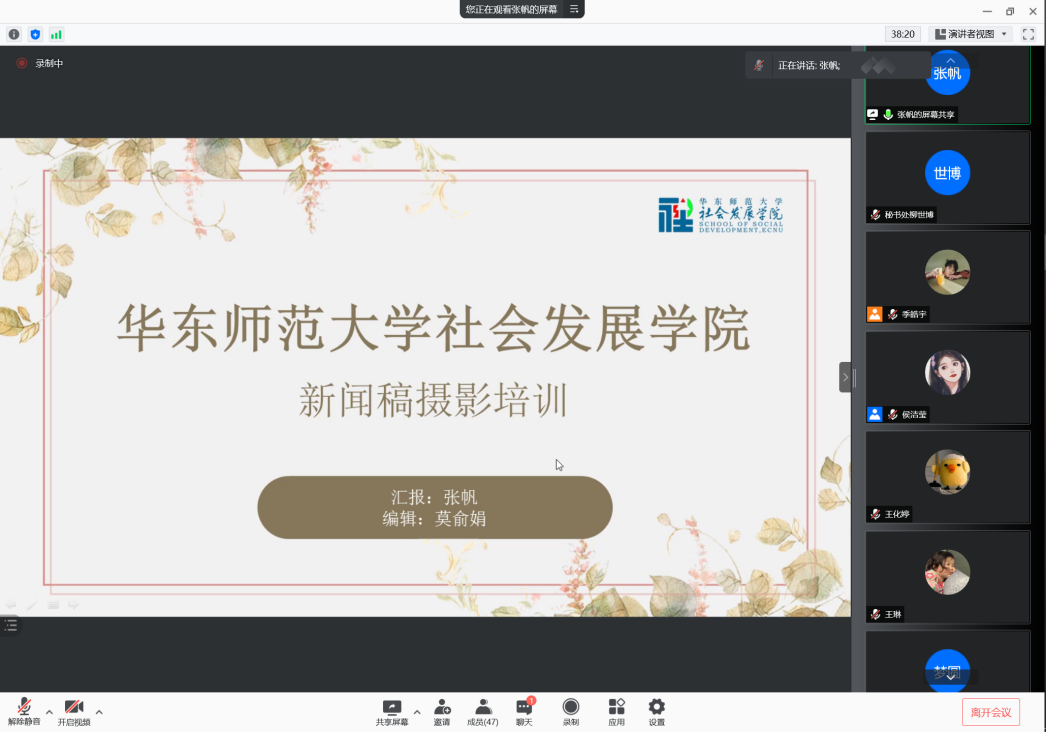 最后,由王化婷同学讲解了如何撰写通讯稿。王化婷同学以参与撰写的通讯稿为例,重点分享了预告类通讯稿、文体活动通讯稿的撰写经验,包括如何展现活动主题,怎样概括活动内容,图片配文如何选择以及怎样呈现活动类别、意义等内容。王化婷总结了会议典礼讲座类通讯稿、文体活动预告通讯稿、文体活动动态类通讯稿的写作要求,包括措辞要求、详略选择、段落划分、框架搭建、署名要求等方面内容。