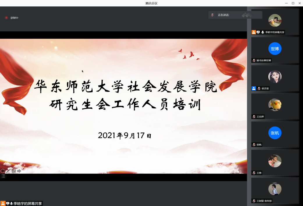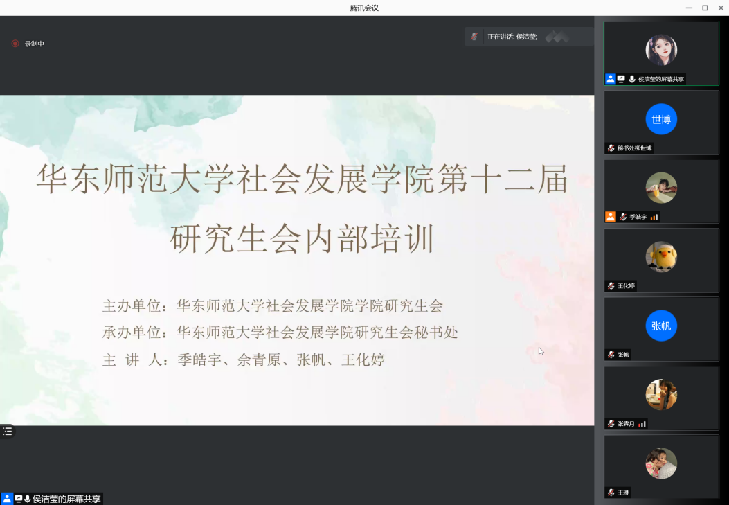 第十二届研究生会第一次内部培训顺利进行。本次培训采用线上方式,第十二届研究生会主席团、部长以及干事参加会议,季皓宇、佘青原、张帆、王化婷担任培训主讲人,秘书处干事侯洁莹主持此次培训。