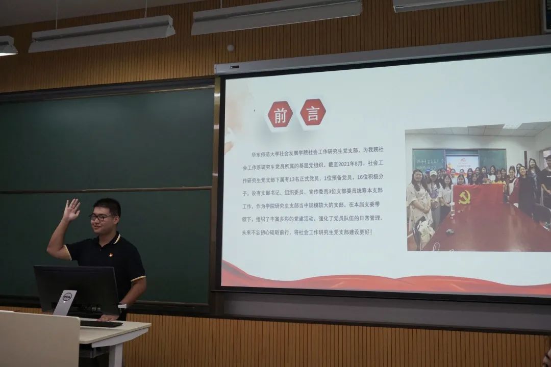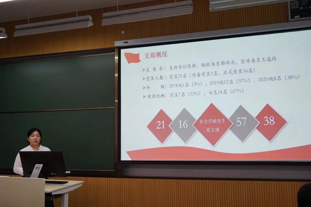 随后,社会学硕士研究生党支部、社会工作硕士研究生党支部、人口所硕士研究生党支部以及博士研究生党支部进行支部风采展示,从支部概况、日常工作、特色党日活动等多个方面向新生展示了各支部的基本图景。