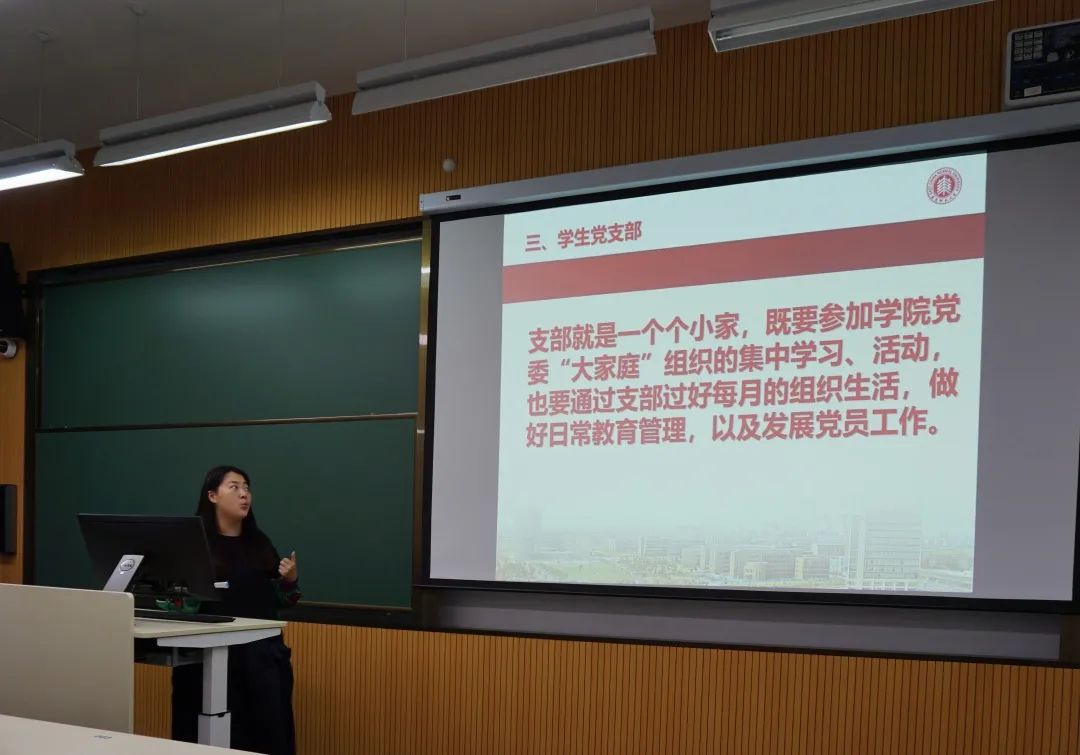 紧接着专职组织员李媛媛老师讲解新生党建工作要点,向新生们详细介绍了研究生党支部概况、学院关于大学生党员日常管理的基本规章制度、新生入党流程中的注意事项等。