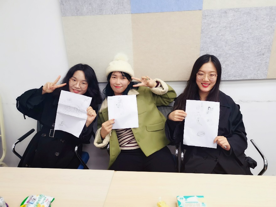至此,进入我们令人期待的游戏环节。活动以简单的暖场游戏开始。同学们在主持人的引领下组成了三支小队,分别是“吃喝玩乐队”、“长生不老队”和“美少女战士队”。在第一个小游戏中,先是大家轮流进行自我介绍。随后主持人随机抽取一位同学,并请另外一名同学对其进行描述,以此使大家相互熟络起来。之后则由每支小队共同为其他队伍的成员画一幅肖像,并请大家猜出画中的人物是谁。在这个环节中,每支小队更是齐心协力,创作出了一幅幅趣作。