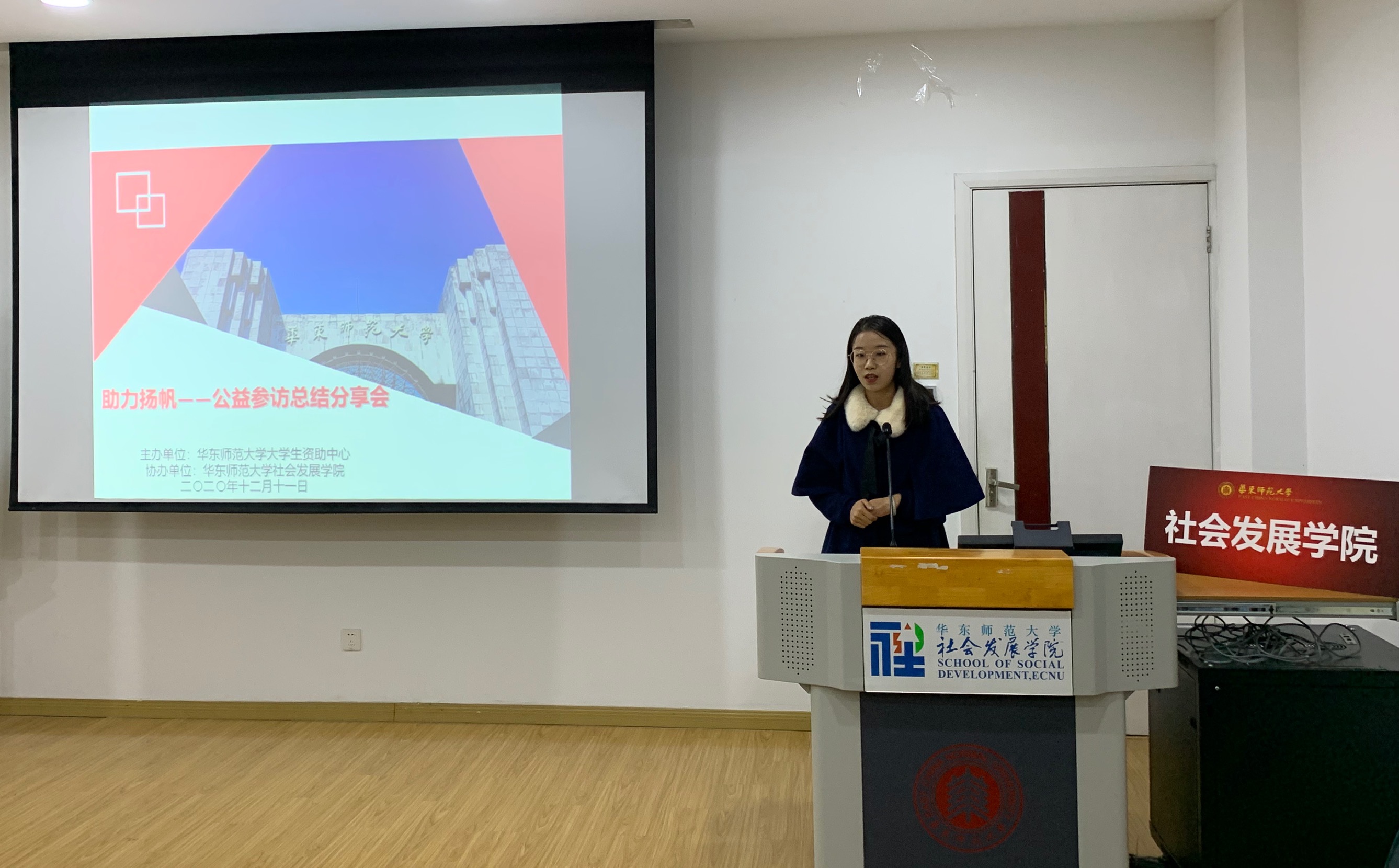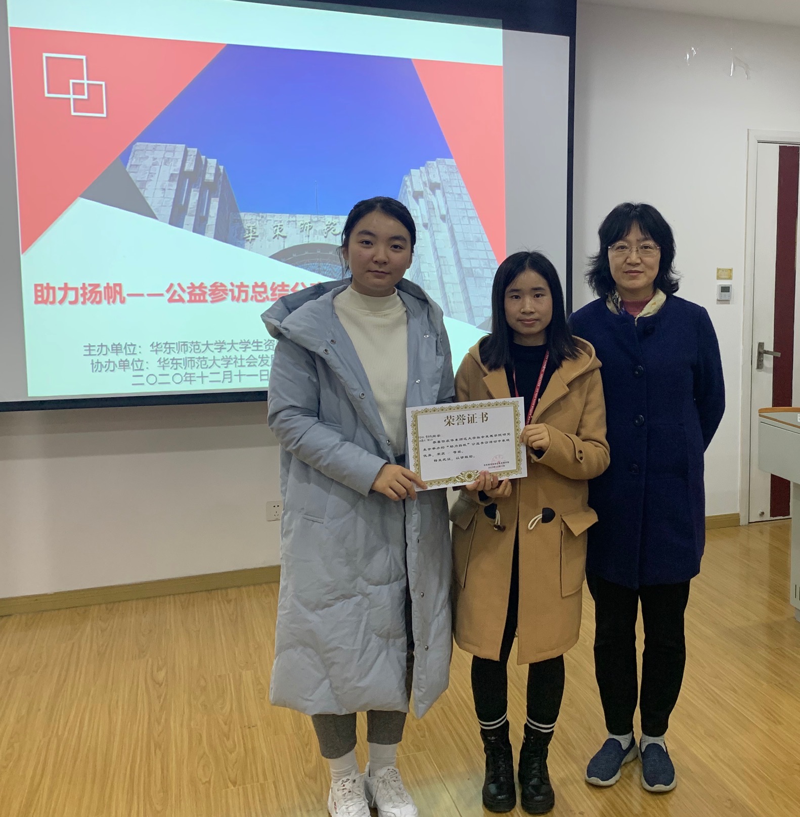 各组汇报完成后,两位老师对同学们的汇报进行了最终的点评。安秋玲老师对同学们的表现和活动的举办表示了肯定,期望同学们能够通过活动进行反思和提高,真正地收获并坚持下去。陆芳萍老师也指出公益是真正地去帮助需要帮助的人,希望大家通过参访活动能够更好地明白如何去致力于社会公平公正。