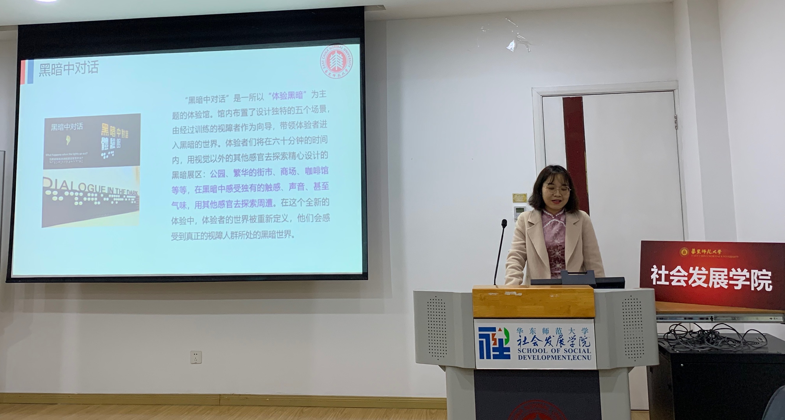 首先是黑暗中对话上海体验馆小组。汇报人指出,参访成员从初入黑暗的不适应到体验缓慢穿过不同地方进行探险,此次体验活动不仅让大家更加珍惜眼前的生活色彩,还改变了自己对视障人士的看法,能够反思我们的生活,更好地与他人建立互信关系。