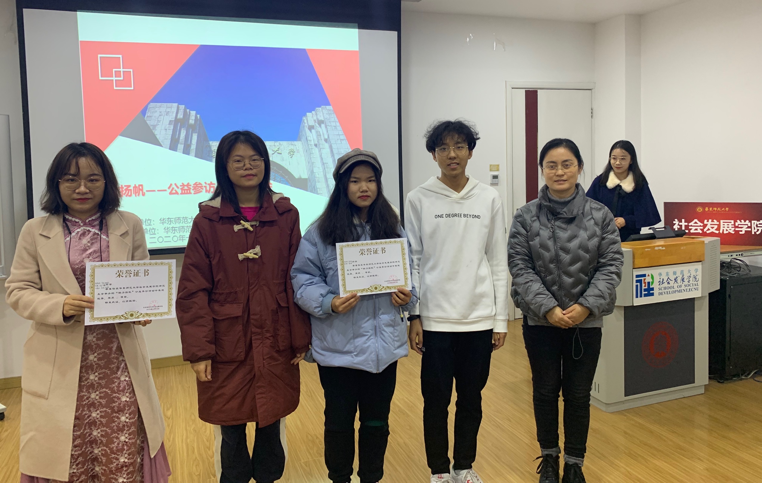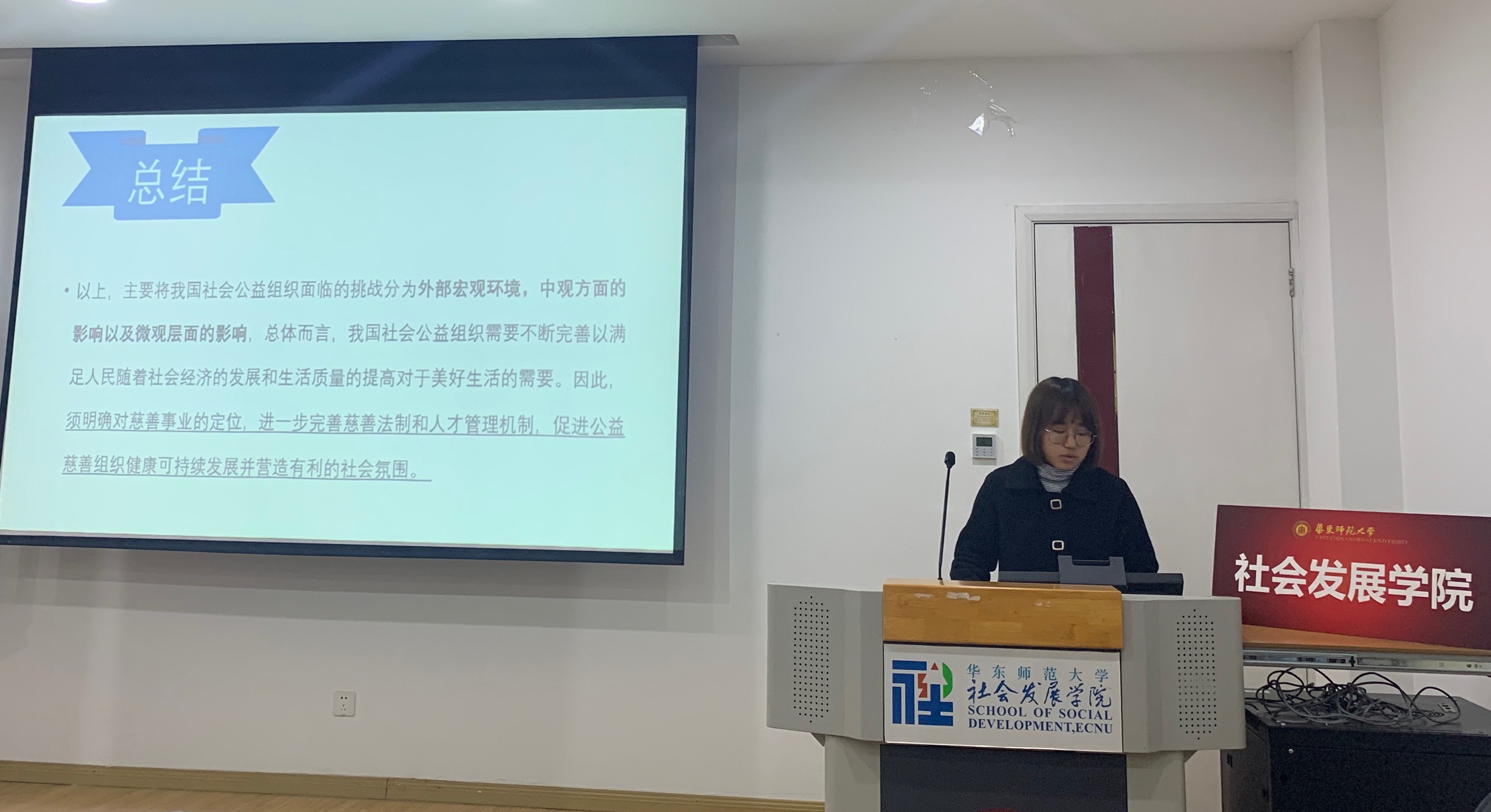 本次公益参访总结会的内容主要分为两部分,首先由各小组展示参访的过程,并针对所参观公益组织问题提出自己的想法,接着老师们对各参访组进行点评,共六组参访小队进行了汇报。