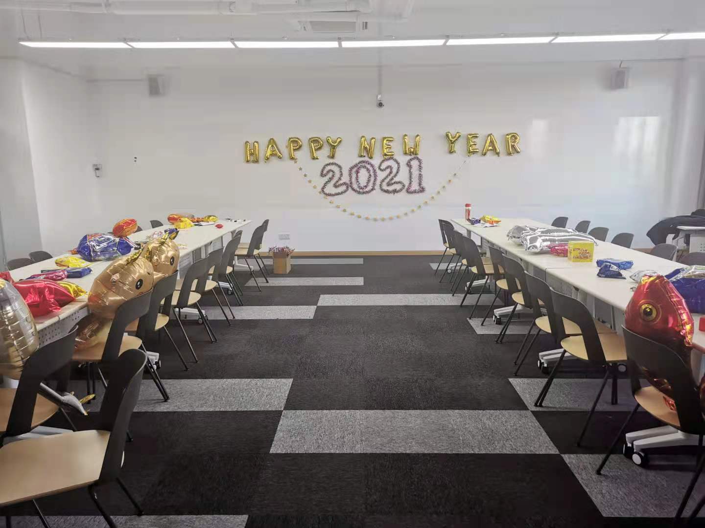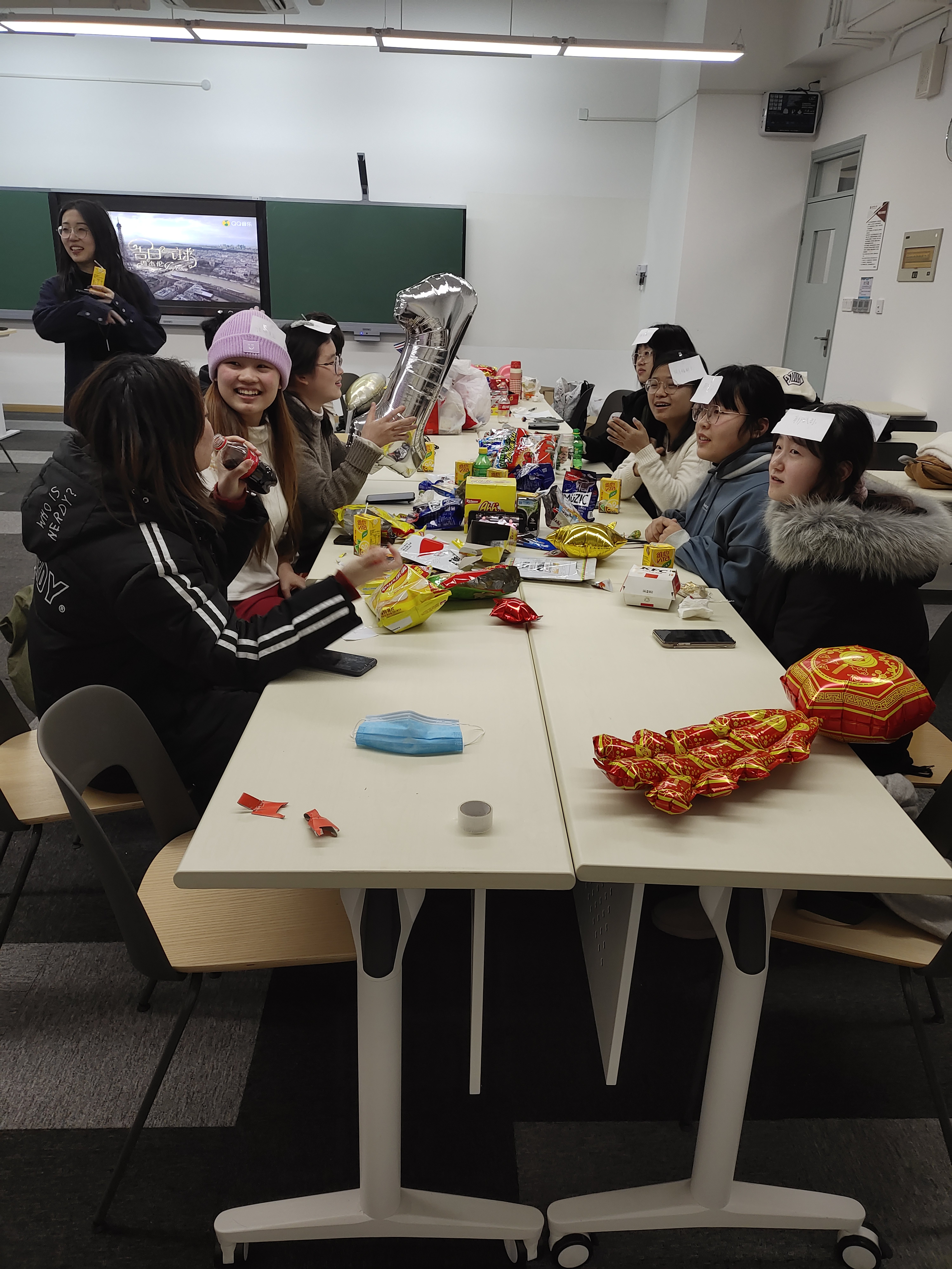 学生会的干事们精心布置了我们的活动会场。气球、挂彩营造了其乐融融的新年氛围,零食、饮料加倍岁末迎新的快乐。