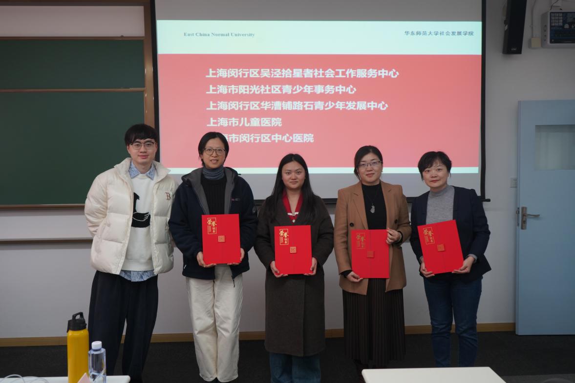 接下来,与会人员共同见证对优秀实习基地和校级示范性实习基地的表彰。社会工作系教师代表蒋潮鑫为上海闵行区吴泾拾星者社会工作服务中心、上海市阳光社区青少年事务中心、上海闵行区华漕铺路石青少年发展中心、上海市儿童医院、上海市闵行区中心医院共5家单位颁发了优秀实习基地荣誉证书。万国威为上海交通大学医学院附属上海儿童医学中心和上海闵行区吴泾拾星者社会工作服务中心颁发了2025年经本科生院认定的校级示范性实习基地证书。吴文钰代表学院向本年度聘任的校级和院级行业导师颁发了聘书。学院希望通过表彰与聘任,感谢实习基地在社会工作实务教学当中的贡献,回馈机构督导的付出,并表达未来携手共建的愿景。