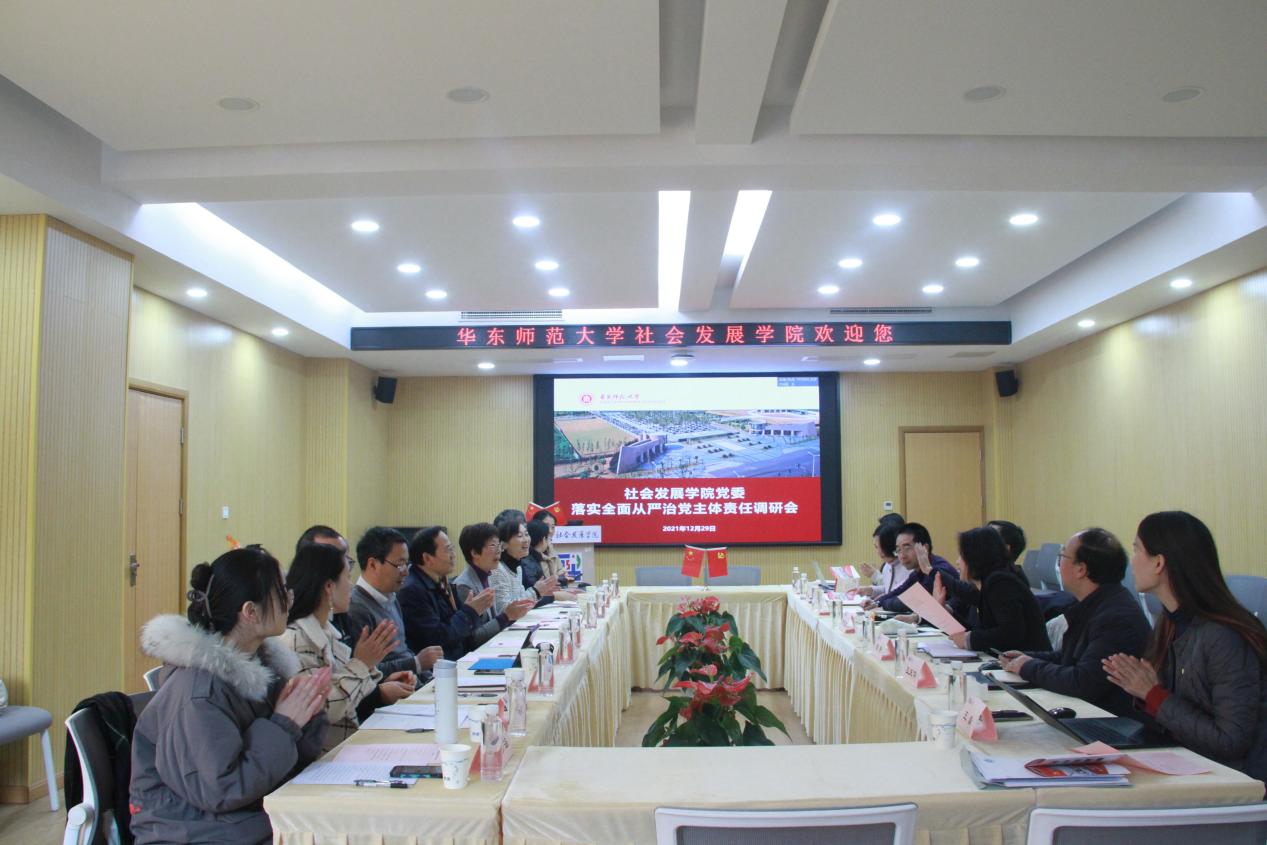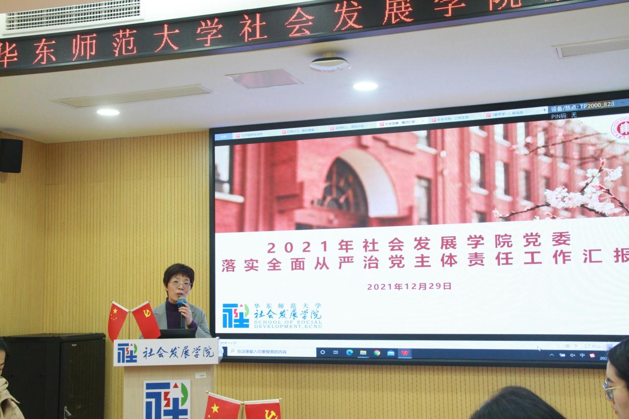 党委书记熊琼代表学院向校领导的莅临指导表示热烈欢迎和诚挚感谢。熊琼围绕政治建设、思想建设、组织建设、作风建设等向与会人员汇报了学院党委落实全面从严治党主体责任的工作情况。以政治建设为统领,着力推进宣传思想工作守正创新。在意识形态阵地、师德师风建设等方面常抓不懈,做实做深日常监督。筑牢思想建设根基,扎实开展党史学习教育。通过专题讨论、以赛促学、红色观影、行走党课、联学共建、志愿服务等形式增强党员的党性修养。持续推进“先锋说”党建品牌推广,发挥党员先锋模范作用。坚持党管人才,充分发挥社会学教研团队作为校首批“立德树人团队”作用。高度重视课程思政示范系(院)的建设工作。发挥学科优势,促进党建与专业深度融合。熊琼认为,学院党委2021年取得了一定的成绩,但在提升党建品牌影响力方面还存在短板,有待进一步努力。回顾总结的同时,特别衷心感谢校党委副书记朱民、校党委副书记、纪委书记曹友谊、副校长周傲英、副校长顾红亮等领导在2021年中多次亲赴学院指导工作。