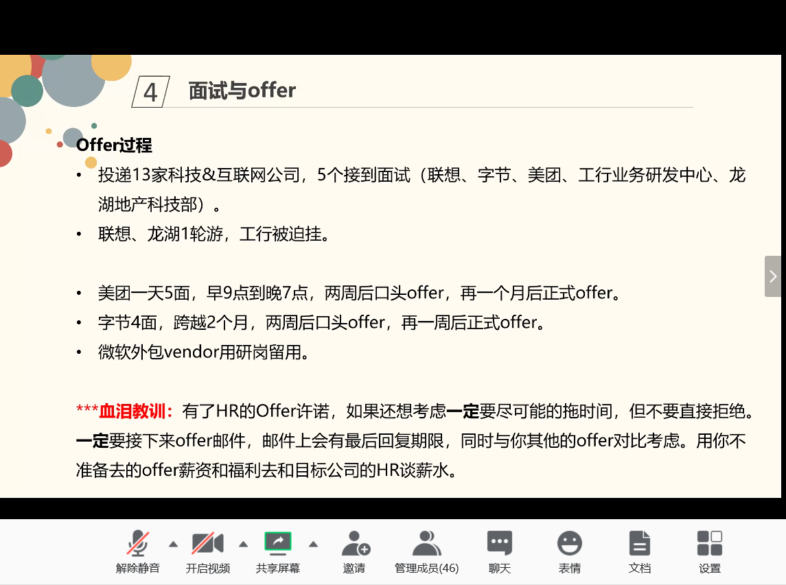 第二节是张梦泽学长的就业分享,他现已签约上海字节跳动。学长主要是依据同学的问题进行分享,着重强调了除了在大型招聘网站上收集信息,还要关注一些少见的招聘渠道,比如职业内部的微信群,以及在收到电话通知录用时时一定要公司的正式邮件offer,以用于后期与其他公司谈薪资条件。针对自己未来方向不是很明确的同学,学长的建议是多实习多体验,在这个过程中或许可以找到自己的兴趣点。学长特为我们提供了上海字节跳动的内推码:GNMNSJN;投递链接://job.toutiao.com/campus/,有兴趣的同学可以作进一步了解。