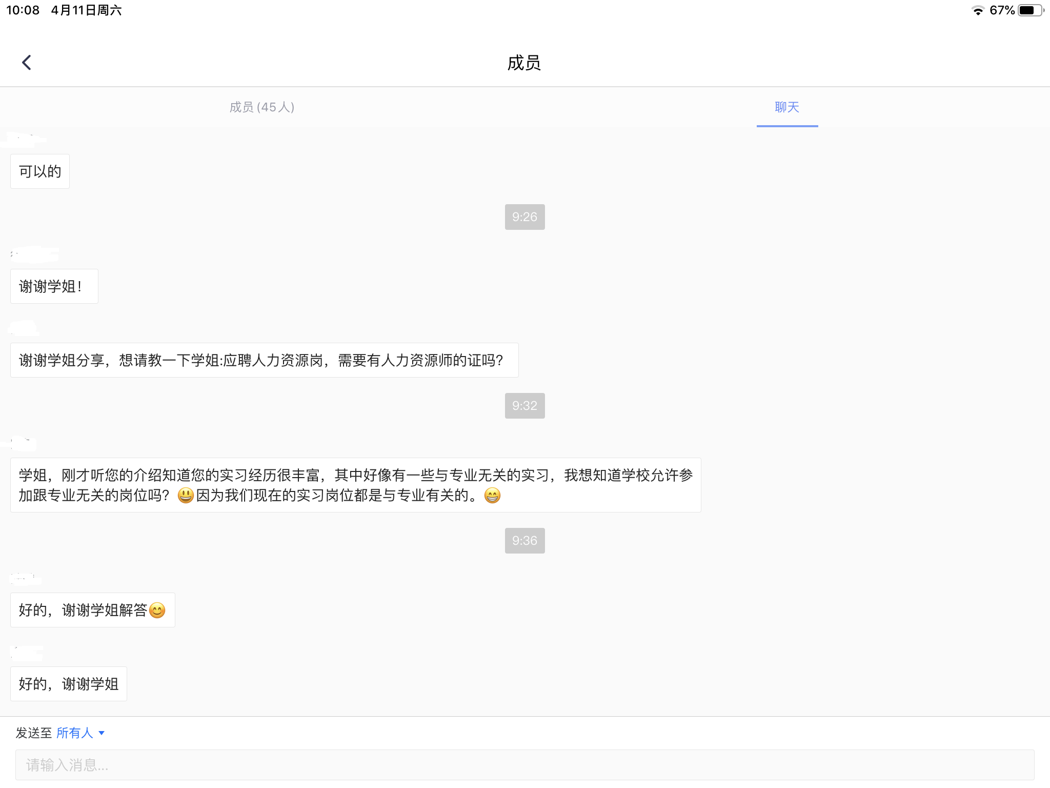 最后答疑环节,同学们积极提出自己的困惑:就已投递简历后该采取的行动、人力资源是否需要专业证书、用研职业对专业是否限制等问题向学长学姐咨询,学长学姐认真表达了自己的看法并提出了意见,着重强调实习的重要性。相信每位同学在本次线上分享会中收获满满,对就业信息进一步明晰。