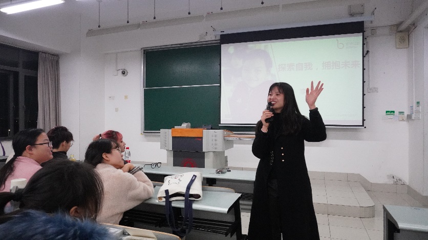2014级社会工作专业、目前任职于佰特公益的李焕学姐回到母校,在闵二教331教室为《社会工作概论》课程的同学们及“大哥哥大姐姐”计划的志愿者们带来了一场以“探索自我,拥抱未来”为题的精彩讲座。社会工作系的赵鑫老师主持了本场讲座。