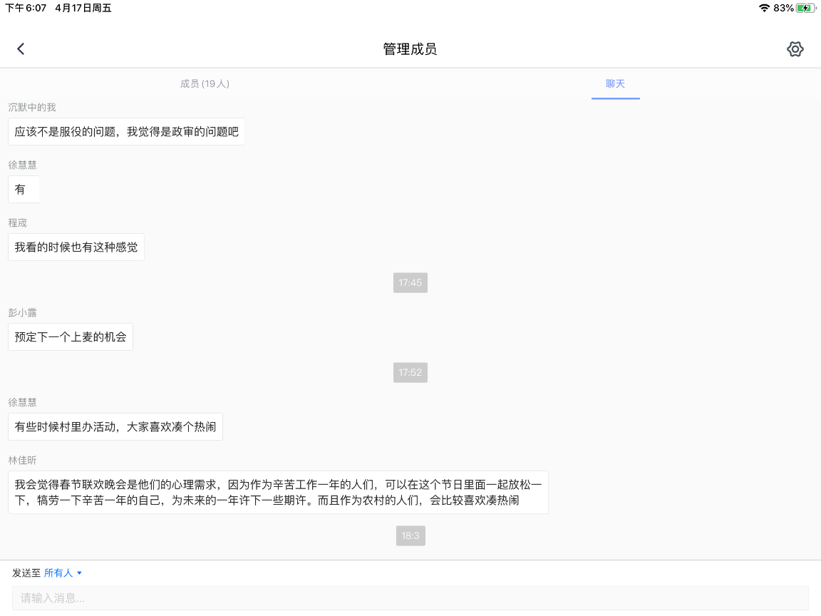徐慧慧的发言引发了同学们对乡村问题的共鸣,林佳昕、董依凌子、杜玥同学纷纷都以自身对农村的认识与思考回应,他们援引了费老的《乡土中国》,或是依据课程中的知识阐发作为城市新一代如何看待城乡之间的时空乃至价值观的差异。