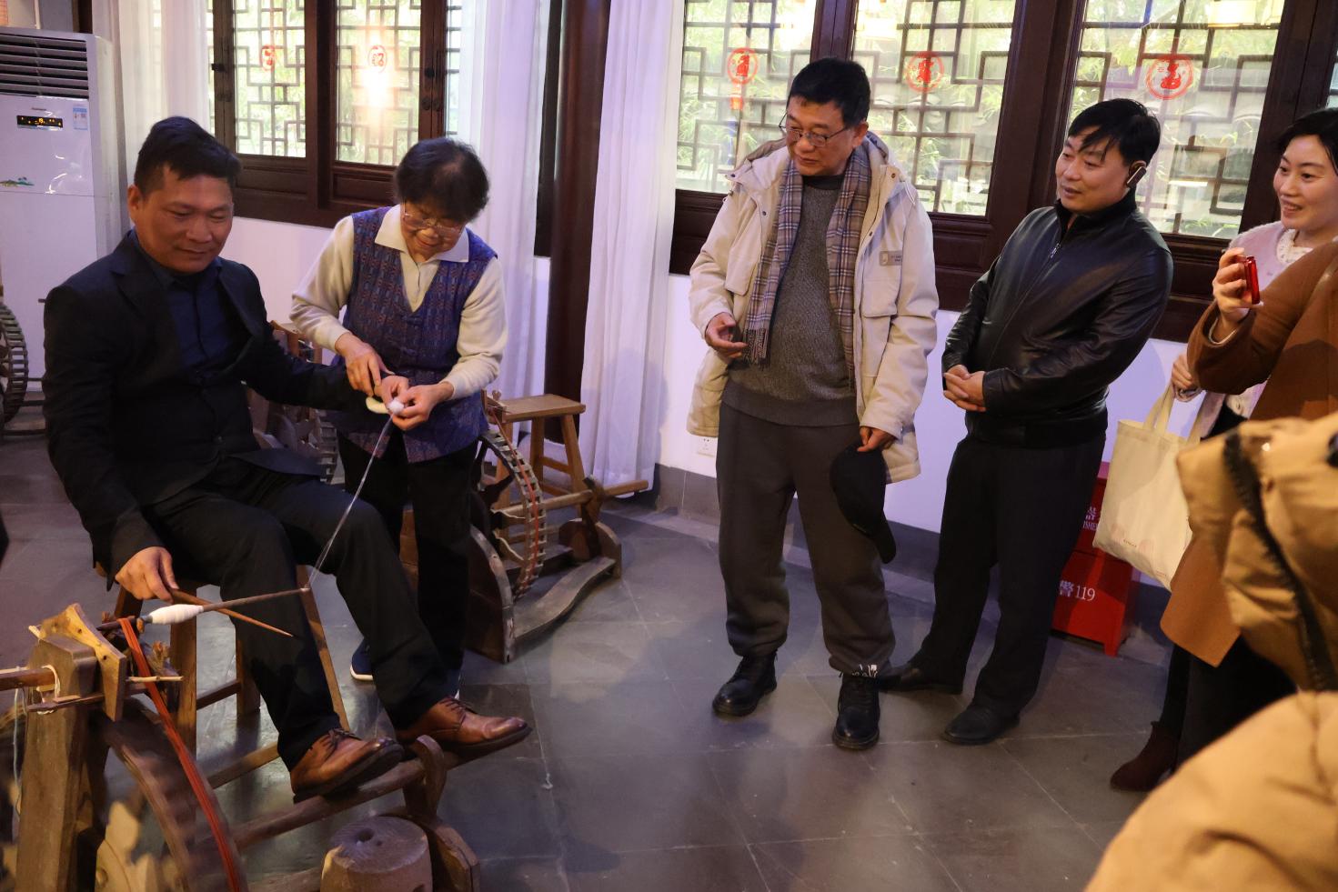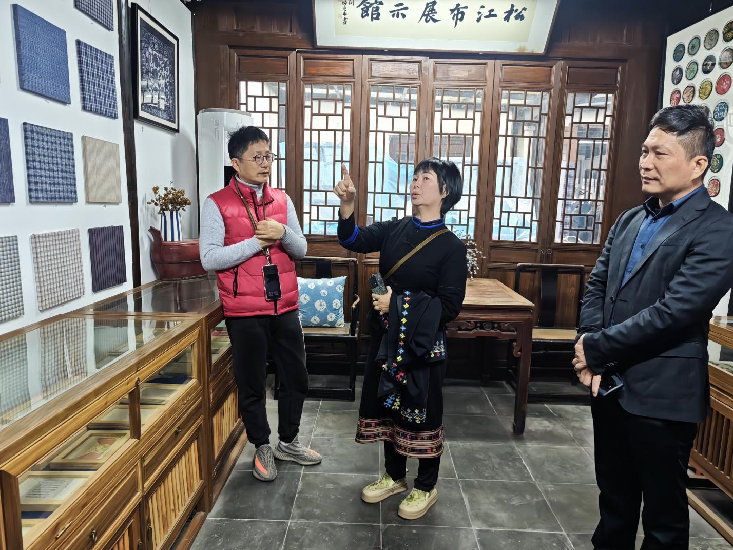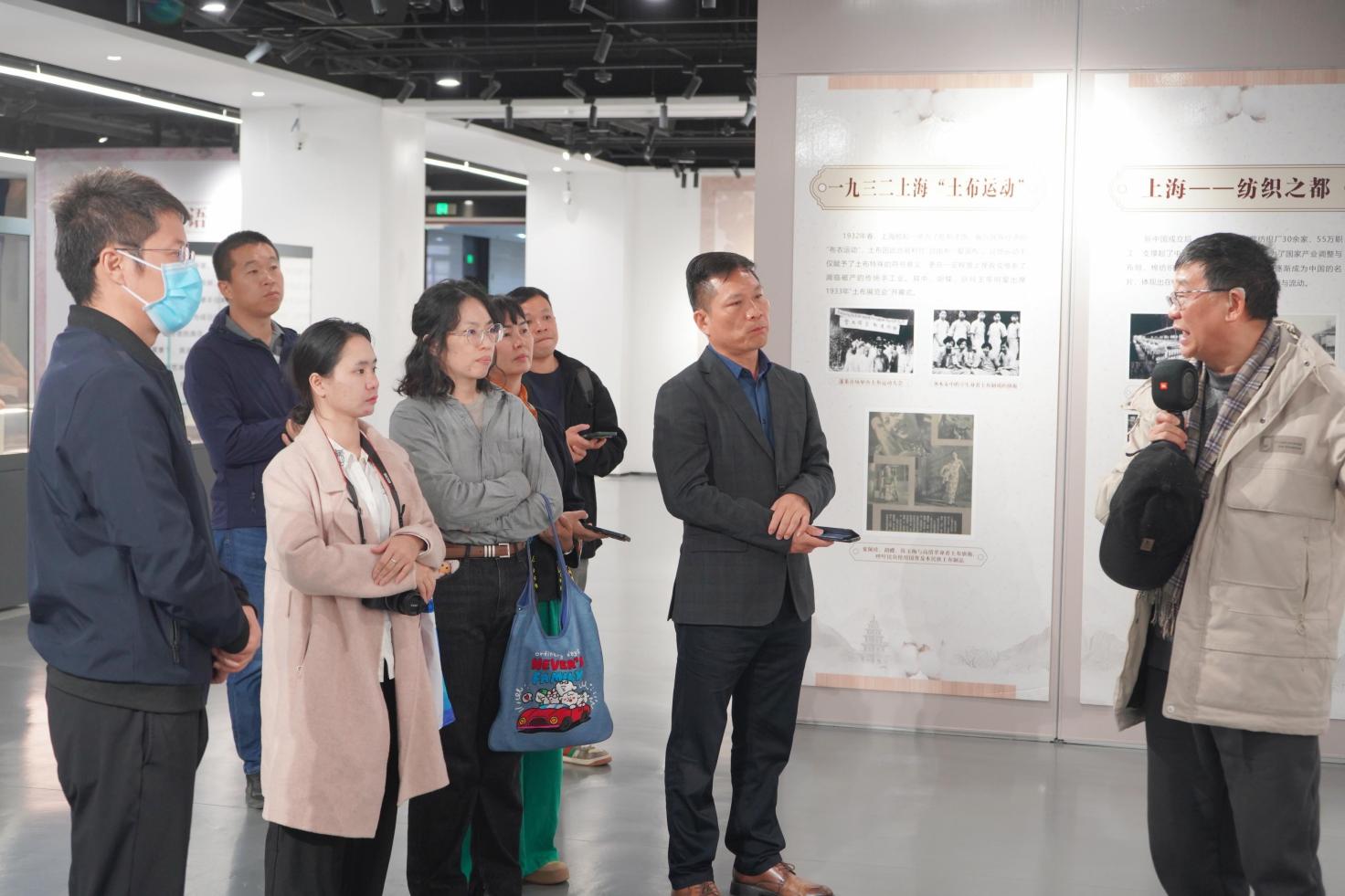 在松江布展示馆,主理人冬野老师为大家生动讲述了松江布走出国门、走向世界的故事。松江布展示馆陈列了各式各样的松江棉布、织布机等,生动展现了古代松江人民男耕女织、安居乐业的生活情景。一行人围绕现代化科技与传统文化的结合做了交流,并在非遗展览、文创研发、研学课程、活动体验等宣传展示渠道方面进行深入讨论。