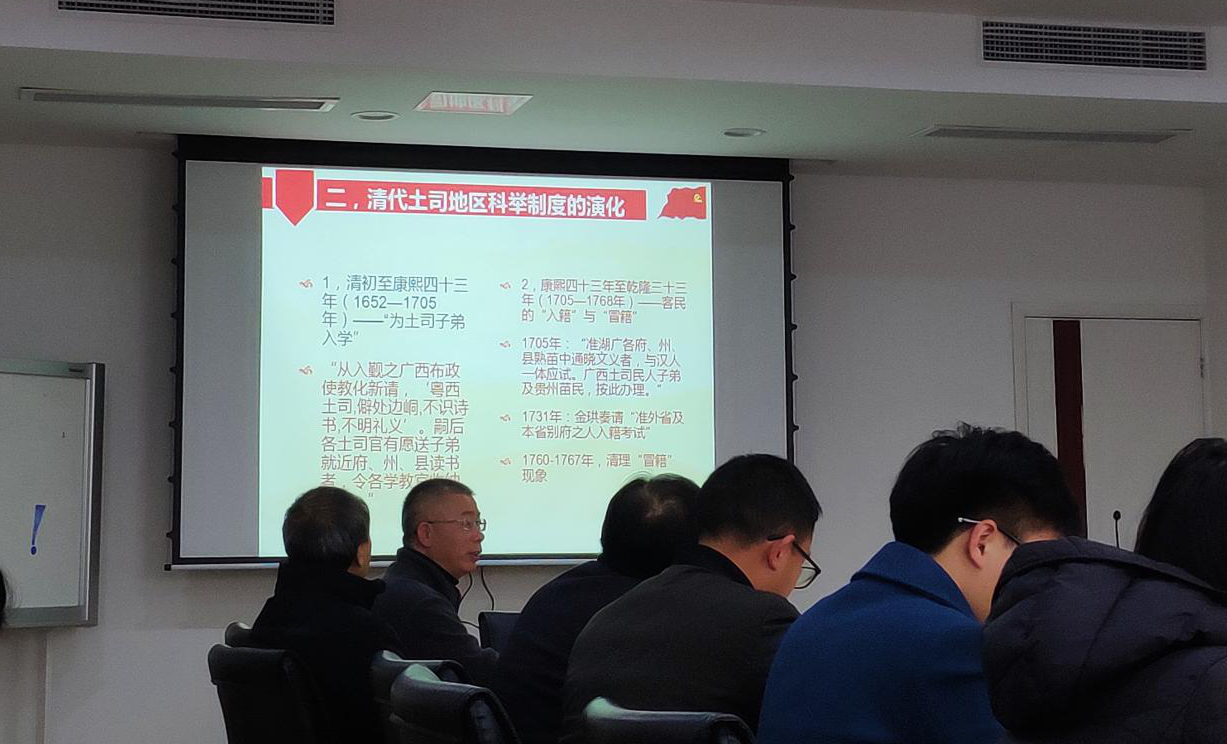 张江华老师从光绪十八年(1892年),太平土州出现的一块石碑说起。太平土州位于今天的广西境内的崇左市大兴县,是清代广西“改土归流”后剩下的43个土司地区之一。石碑陈述的是该地一个历史过程的延续。自明清以来,朝廷的“教化”政策与科举的推进导致该地区所出现了社会文化变迁的过程。紧接着张老师带我们从大背景出发,介绍了清代广西土司社会与土地制度,因为社会分层依赖于土官授田确认,并依据于其所承担的社会功能,土地被区分为不同范畴。张老师指出,这是一种与其他壮傣地区类似的人力控制与土地控制相结合的制度。随后张老师分析了清代土司地区科举制度的演化,梳理了四个阶段的演化:清初至康熙四十三年(1652-1705年)——“为土司弟子入学”,康熙四十三年至乾隆三十三年(1705-1768年)——客民的“入籍”与“冒籍”,1731年,“准外省及本省别府之人入籍考试”;1760-1767年,清理”冒籍”现象。