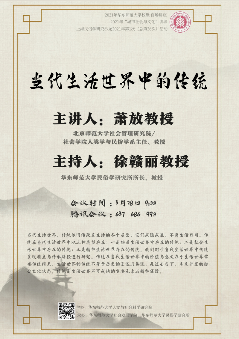 民俗学研究所特邀请北京师范大学社会管理研究院/社会学院人类学与民俗学系主任萧放教授作题为“当代生活世界中的传统”的讲座。