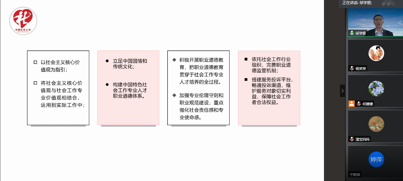 讲座的第四部分,邹老师认为社会工作的高质量发展包括职业道德和职业伦理的强化,以社会主义核心价值观为指引,将社会主义核心价值观与社会工作价值观相结合,立足中国国情和传统文化,构建中国特色社会工作专业人才职业道德体系,积极开展职业道德教育,完善职业道德监管标准。