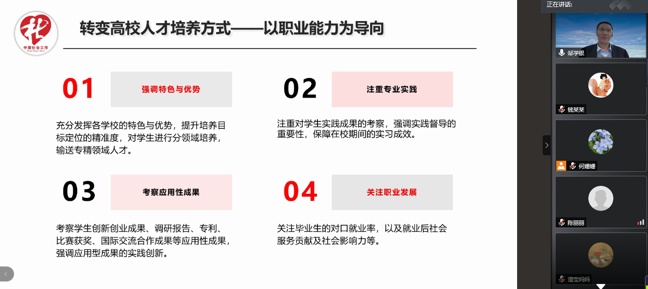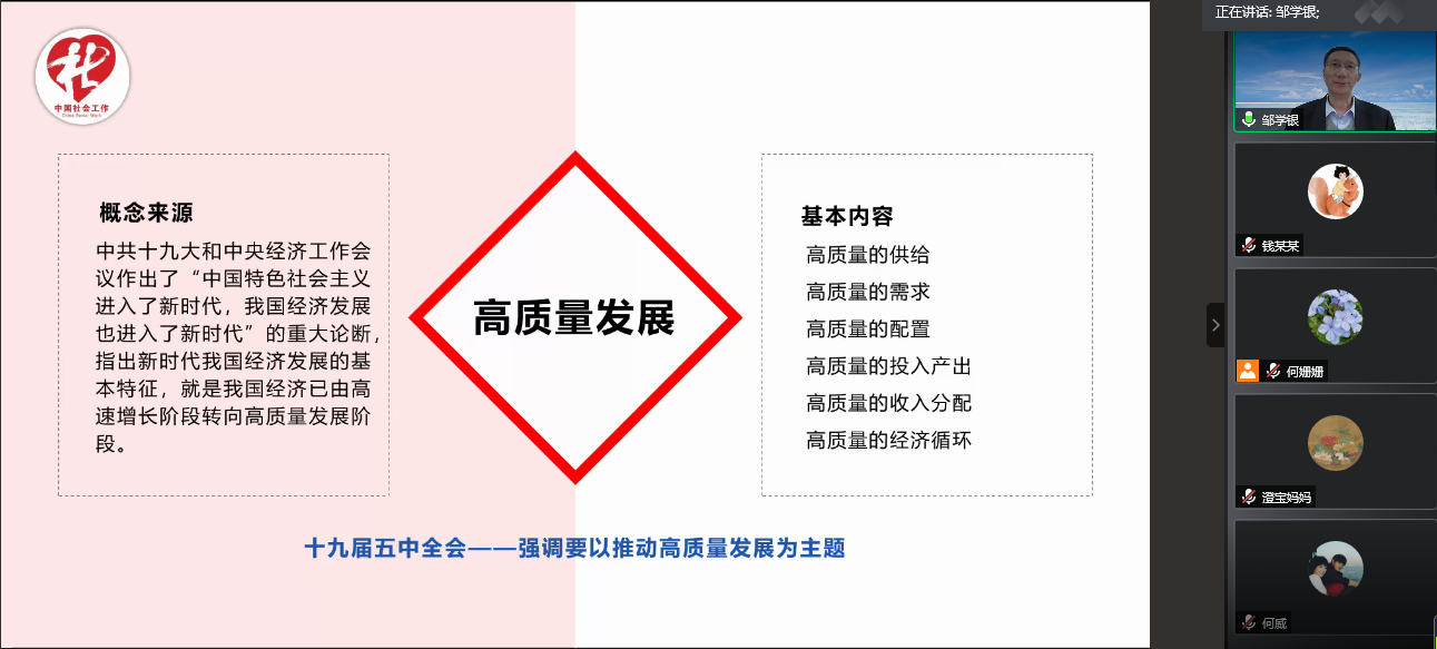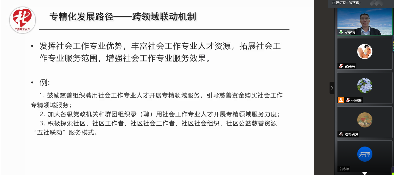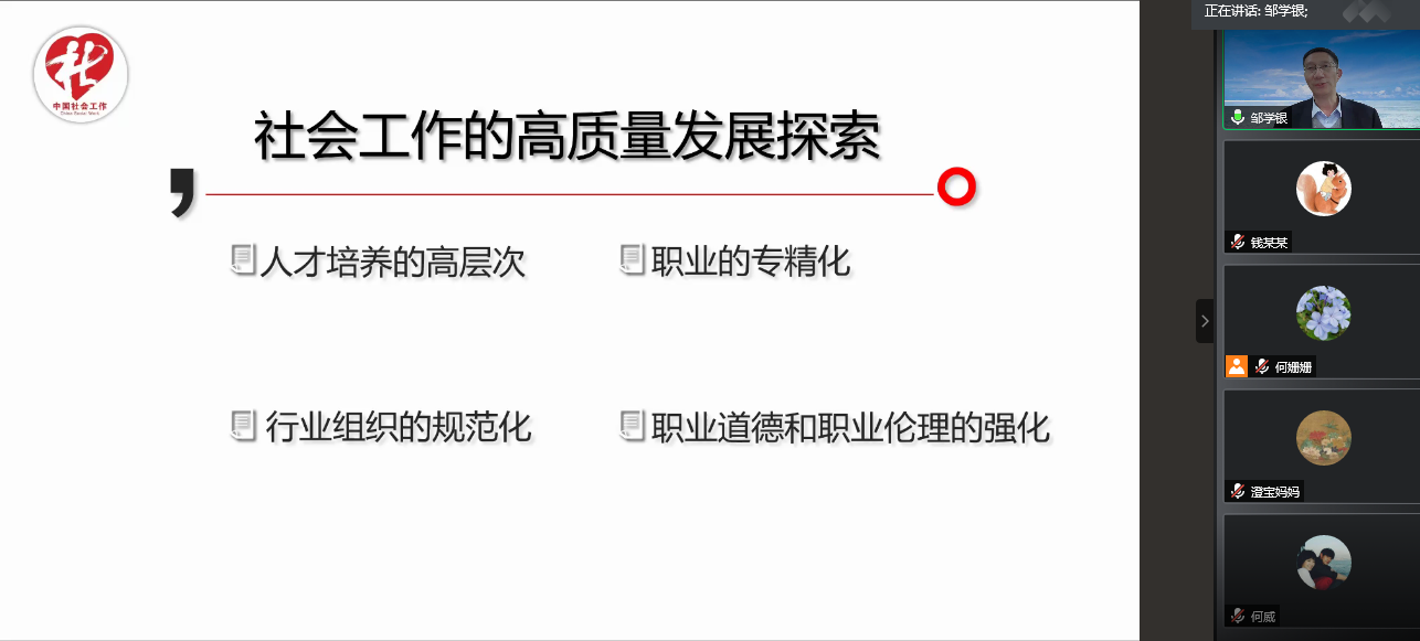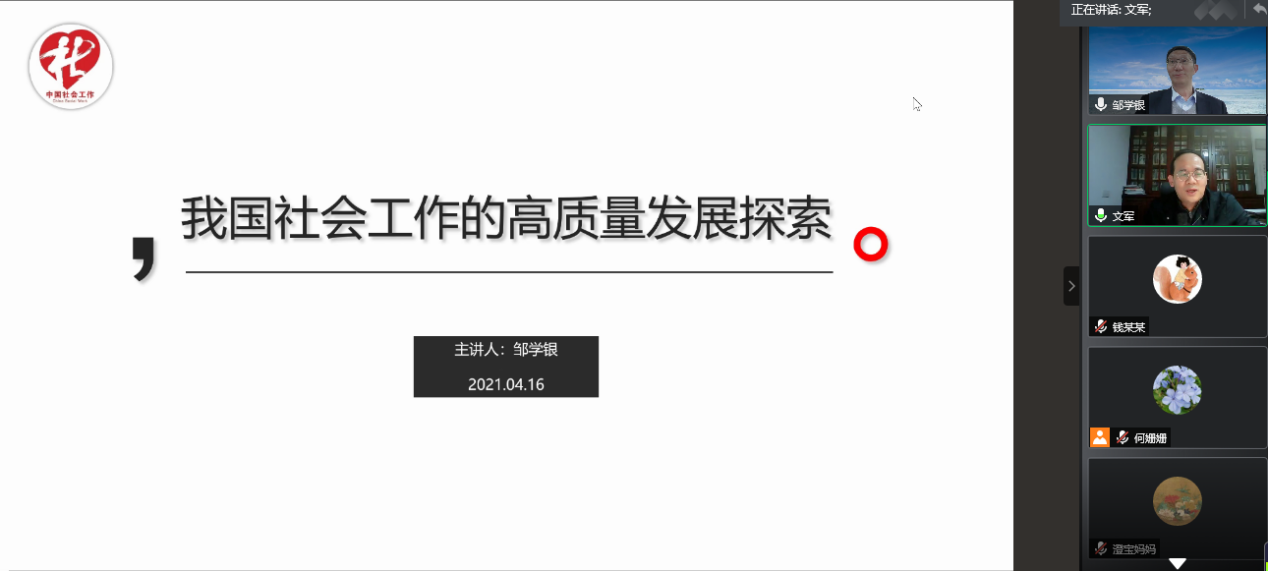 社会工作系主办的沪江名家讲坛第十四讲借助腾讯会议网络平台,与大家在云端相聚。北京社会管理职业学院(民政部培训中心)社会工作研究所所长邹学银老师,为大家带来了《我国社会工作的高质量发展探索》为主题的线上讲座,木瓜视频