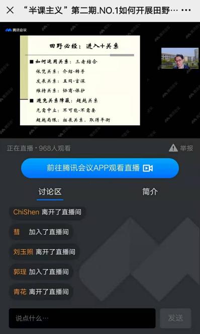 4月27日晚上6点,“质性研究系列讲座”第一讲“如何开展田野调查”以腾讯会议直播的形式准时开始,姚泽麟老师担任主持人、致开讲词,直播开始后,在线观看人数迅速攀升近千人。本讲围绕“搜集研究素材”展开,耿曙老师以生动形象和风趣切实的精彩语言阐述田野调查与访谈方法。首先,耿老师讲述了田野调查的重要性与乐趣,说明“没有田野就没有质性研究”。其次,耿老师从自身的田野经验出发,向大家介绍了如何进入田野、田野调查的具体手段以及如何选择田野点、选取被访人。耿老师尤其通过丰富的细节讲解了访谈中的技巧和原则,强调判断“情境”的重要性。最后,耿老师也提醒田野过程中可能遭遇的辛苦与挫折,叮咛听众“方法需要实践,不能纸上谈兵”,要在实践中锻炼访谈。