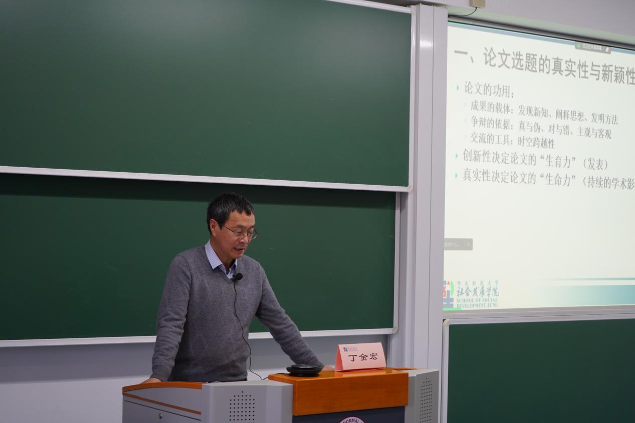 丁金宏教授的报告聚焦于论文写作的关键要素。首先,他强调了论文选题的真实性与新颖性,指出创新性决定了论文的“生育力”,而真实性则是论文的“生命力”所在。随后,丁老师详细阐述了研究过程中的扎实性,从阅读、综述到调查访谈、数据分析等方面具体展开,尤其在写作文献综述时,他语重心长地强调了谦虚的态度,不轻易“踩低捧高”,而是要站在巨人的肩膀上,谨慎进行研究。最后,丁老师提到了学术修辞的朴实、直白的重要性,指出科学文字的要求是“文如看水爱清澈”,必须准确、简洁,不应使用华丽但含混不清的修辞,确保论文更易读、易懂。丁老师还以不同写作类型的政府工作报告为例,为现场的同学们做了生动形象的示范讲解,朴素而铿锵有力的话语引得在场学子不由自主纷纷点头,在场的同学们记下笔记收获满满。