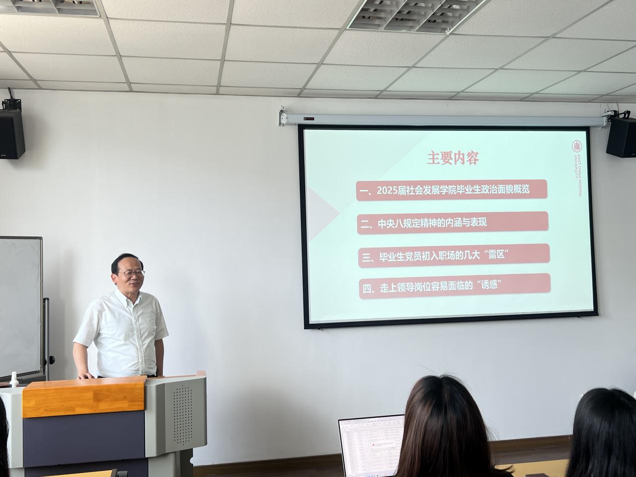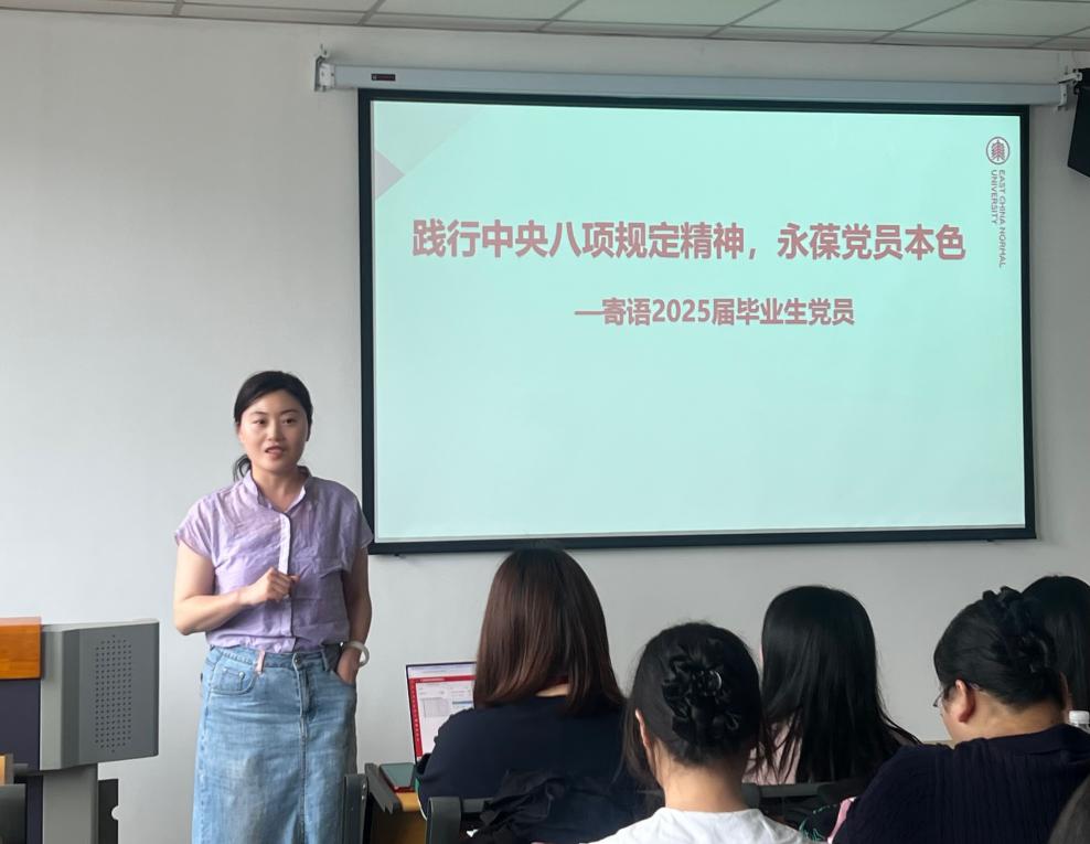 庞荣以“践行中央八项规定精神,永葆党员本色”为题,就中央八项规定与中央八项规定精神的理解与同学们展开交流互动,并介绍了规定背景、内容、通报执行情况及作用影响,通过典型案例帮助同学们全面深入领悟中央八项规定精神。庞荣寄语2025届毕业生党员,希望同学们无论未来遇到什么困难和挑战,都要坚守党员底线,永葆党员本色,在各自的岗位上发光发热。