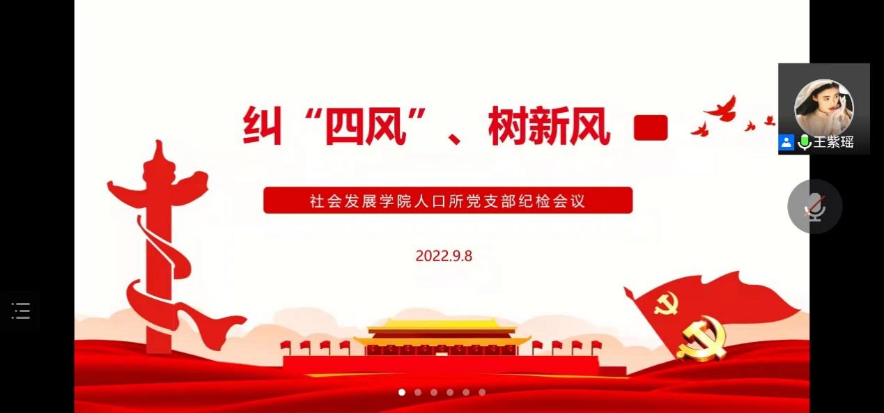 为进一步加强支部作风建设、营造风清气正的支部氛围,根据中央纪委国家监委驻教育部纪检监察组、上海市纪委监委、学校纪委的工作要求,人口所硕士研究生党支部于9月8日晚召开“纠四风、树新风”专题学习会,传达学校相关通知精神,会议由支部书记张帆主持、纪检委员王紫瑶同志主讲。