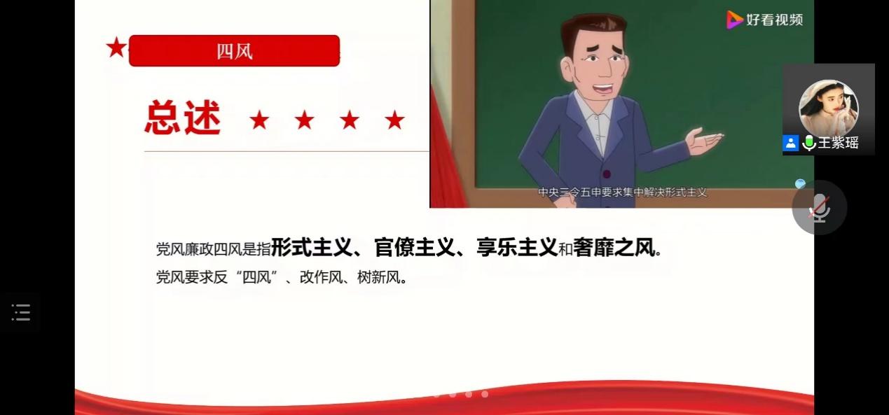 王紫瑶同志详述了形式主义、官僚主义、享乐主义和奢靡之风这“四风”的表现,明确了反“四风”、改作风、树新风的基本方向。同时,强调了中秋、国庆双节期间,纠“四风”、树新风的重要性,从“提高政治站位,严格落实抓作风建设的政治责任”“坚持纠树并举,大力弘扬新风正气”“‘四责’联动贯通,坚决纠治突出问题”“加强节点纠治工作,持续释放从严信号”等四个方面,指明了双节期间纠“四风”、树新风的具体要求。会上,王紫瑶还对违反中央八项规定精神典型案例进行了剖析,引导支部党员以案为鉴,不断增强党性观念,强化纪律意识。全体参会人员还共同学习了《关于贯彻落实习近平总书记重要指示精神 集中整治形式主义、官僚主义的工作意见》。