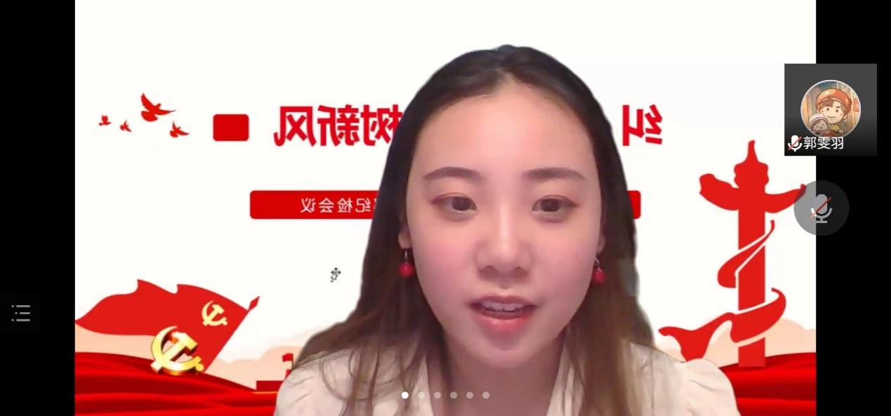 30多位支部党员、入党积极分子在线参会,通过本次学习会增强了支部党员的党性修养和行动自觉。支部组织委员戚珍珍表示,作风建设永远在路上,不能丝毫懈怠,更不能视而不见,作为一名党员,要切实当好纠“四风”的组织者、实践者、推动者和践行者,有效发挥表率作用。支部党员申欣如表示,在学习生活之中,我们一定要坚决纠正“四风”,坚决与坏的作风进行斗争。我们只有求真务实,才能融入到大家的心里,才能真正获得大家的点赞。张俊表示,作为青年党员,我们要立志做党的光荣传统和优良作风的忠实传人,保持高度警醒,牢守廉洁底线,涵养对道德法纪的敬畏之心,锤炼忠诚干净担当的政治品格,做信念坚定的明白人、规矩人。