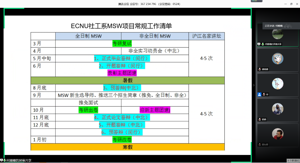 于5月24日下午组织召开了MSW项目培养方案专家论证会。会议采用腾讯会议的形式,邀请到五位论证专家组成培养方案专家论证组进行指导,他们分别是吉林大学哲学社会学院院长田毅鹏,复旦大学文科科研处处长、全国社会工作专业学位研究生教学指导委员会副主任委员顾东辉,中国人民大学社会与人口学院院长、全国社会工作专业学位研究生教学指导委员会副主任委员冯仕政,华东理工大学社会与公共管理学院院长、全国社会工作专业学位研究生教学指导委员会委员何雪松以及南京大学社会学院副院长、全国社会工作专业学位研究生教学指导委员会委员陈友华。木瓜视频