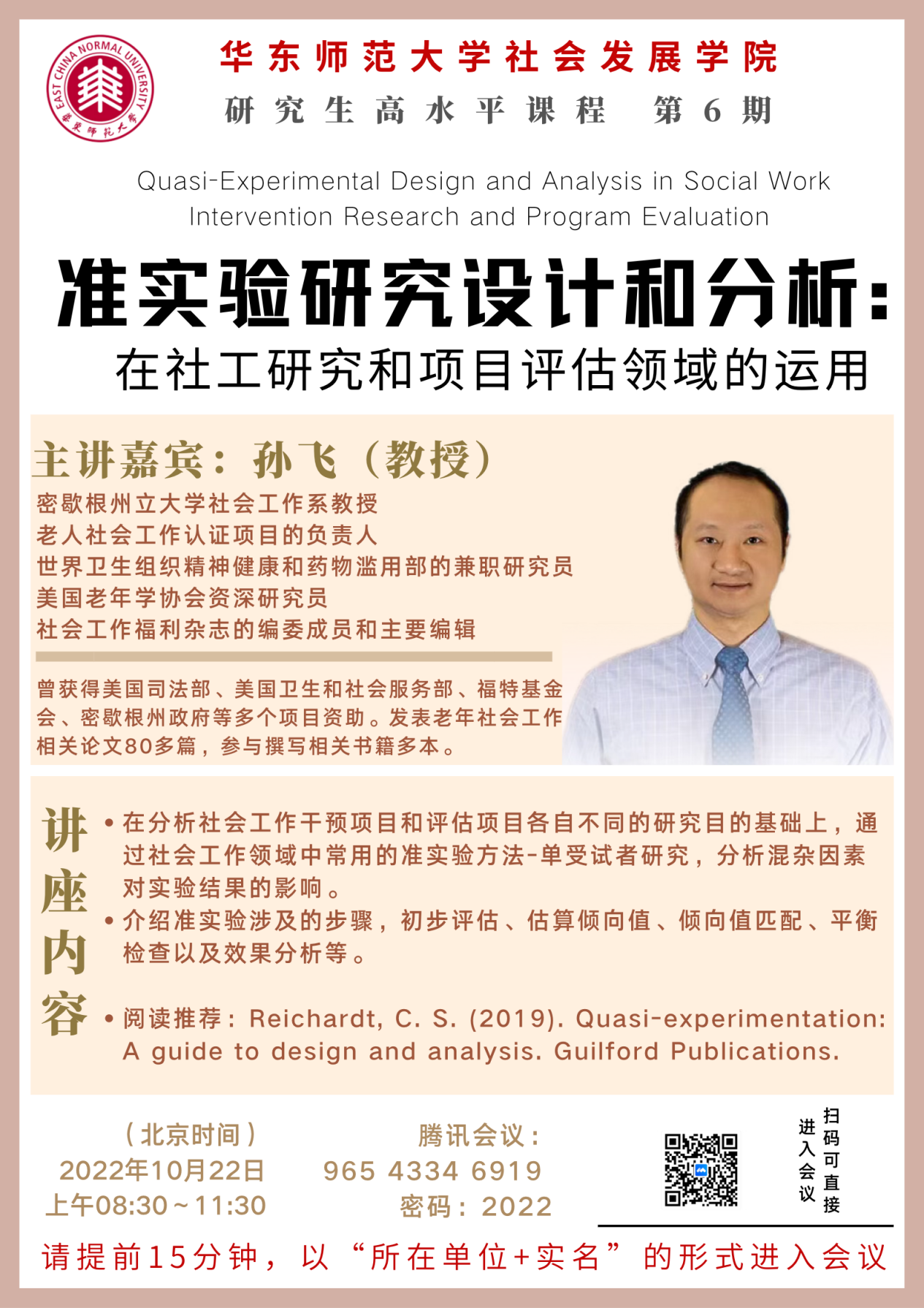 本次讲座由密歇根州立大学社会工作系孙飞教授主讲,将在分析社会工作干预项目和评估项目各自不同的研究目的基础上,通过社会工作领域中常用的准实验方法-单受试者研究,分析混杂因素对实验结果的影响。本次讲座还将会介绍准实验涉及的步骤,初步评估、估算倾向值、倾向值匹配、平衡检查以及效果分析等。快来一起上课吧!