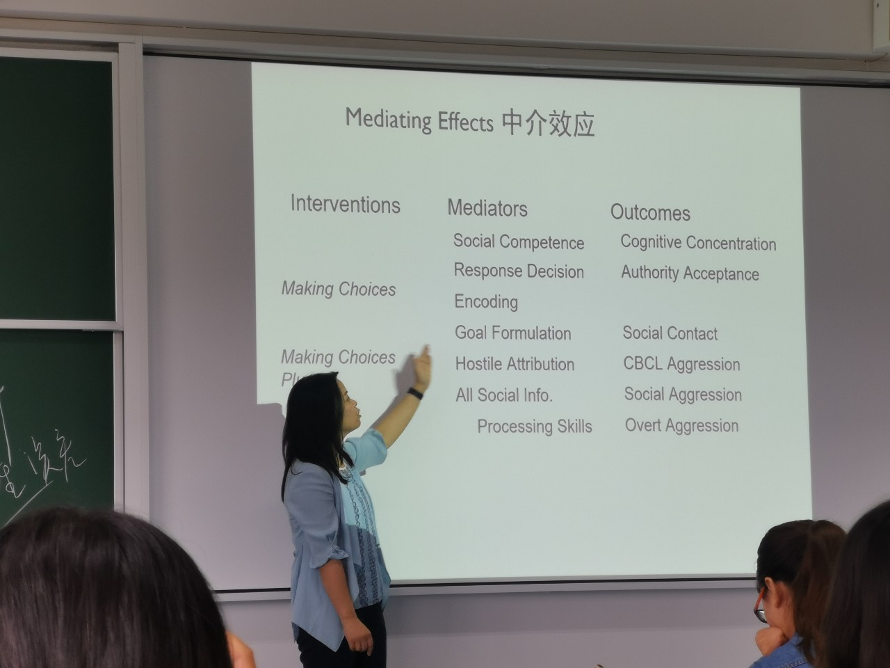 除此之外,对于干预研究中的中介效应、项目理论等重要部分,吴帆教授也进行了具体的讲述。有关于干预研究进行的实验设计、干预效果的评估方面,吴帆教授的讲述引发了在场老师和学生们的思考。紧接着,吴帆教授对于项目开展过程中遇到的困难进行了分享,分析了在中美不同文化背景下,项目进行过程中项目干预内容设计方面的调整和思考。从中国现实的国情出发,项目的内容需要很多的改变,更多的适应于教学的现实因素,在此基础上,调整项目内容以适应服务对象的需求,从而也达到满足项目研究的目的。