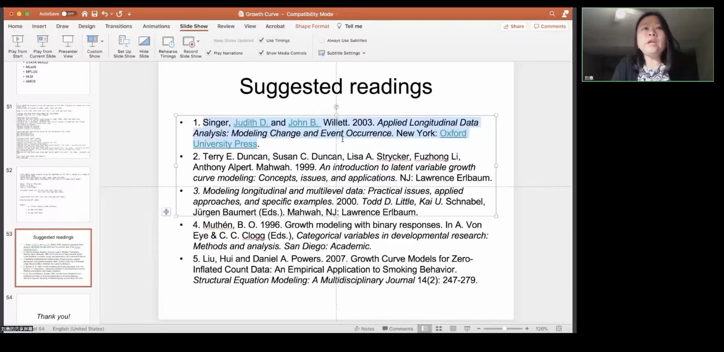 讲座开始之前,安秋玲老师向刘惠教授表示热烈欢迎。安秋玲老师提到,刘惠教授在人类健康和福祉相关的家庭社会关系领域颇有建树,曾获得美国国立卫生研究院职业奖等多个知名奖项。安秋玲老师表示非常期待刘惠教授接下来所带来的研究分享,希望同学们也能够在有限时间里与刘老师多多交流,更好地学习有关纵向数据的专业知识。